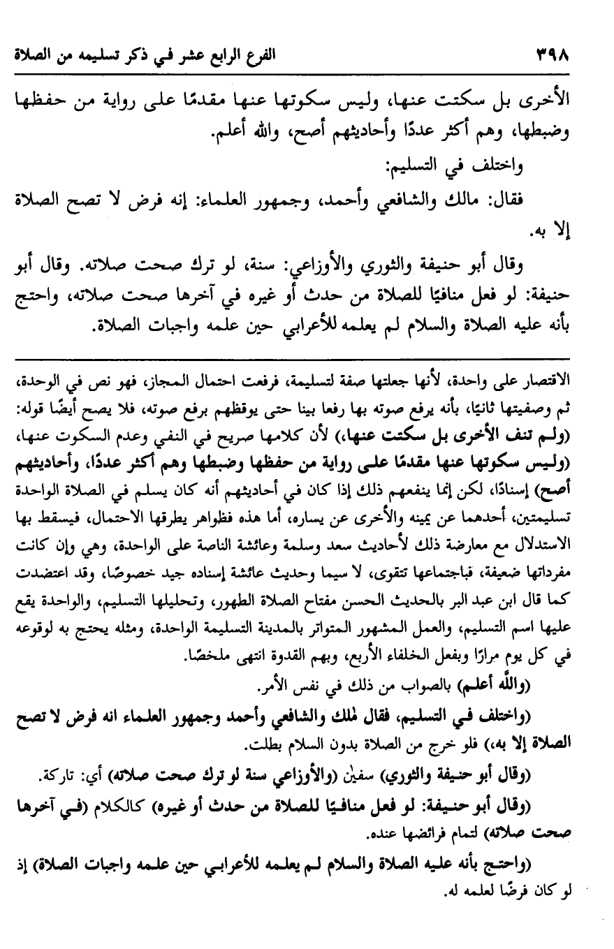 وقال أبو حنيفة والثوري والأوزاعي: سنة، لو ترك صحت. قال: وقال أبو حنيفة: لو فعل منافيًا للصلاة من حدث أو غيره في آخرها صحت صلاته، واحتج بأنه عليه الصلاة والسلام لم يعلمه للأعرابي حين علمه واجبات الصلاة.
