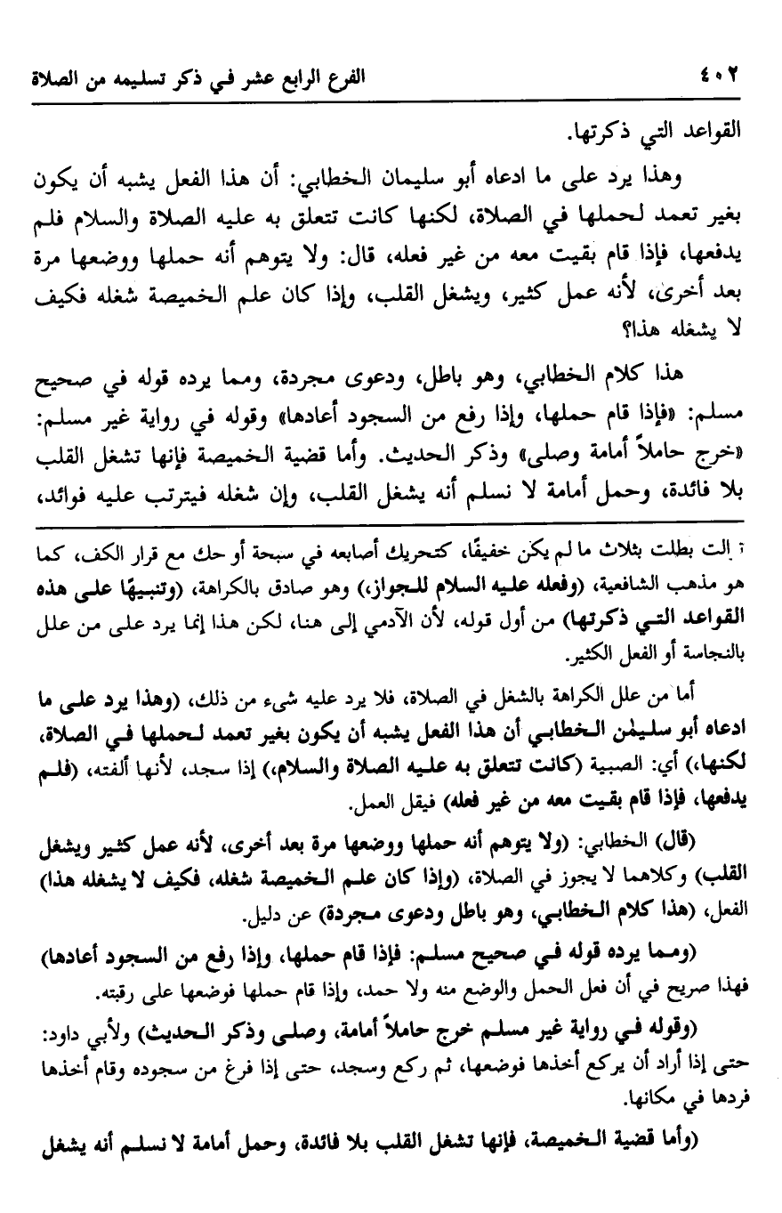 هذا كلام الخطابي، وهو باطل، ودعوى مجردة، ومما يرده قوله في صحيح مسلم: "فإذا قام حملها، وإذا رفع من السجود أعادها" وقوله في رواية غير مسلم: "خرج حاملا أمامة وصلى" وذكر الحديث. وأما قضية الخميصة فإنها تشغل القلب بلا فائدة، وحمل أمامة لا نسلم أنه يشغل القلب، وإن شغله فيترتب عليه فوائد،