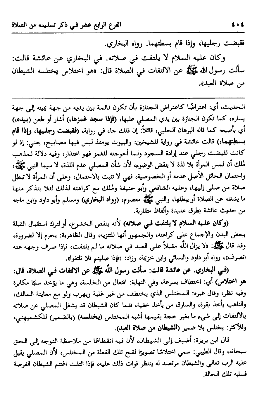 وكان عليه السلام لا يلتفت في صلاته. في البخاري عن عائشة قالت: سألت رسول الله صلى الله عليه وسلم عن الالتفات في الصلاة قال: "هو اختلاس يختلسه الشيطان من صلاة العبد".
