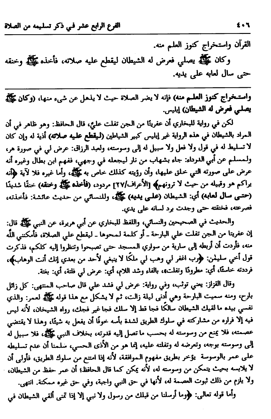 واستخراج كنوز العلم منه" فإنه لا يضر الصلاة حيث لا يذهل عن شيء منها، "وكان صلى الله عليه وسلم يصلي فعرض له الشيطان" إبليس.