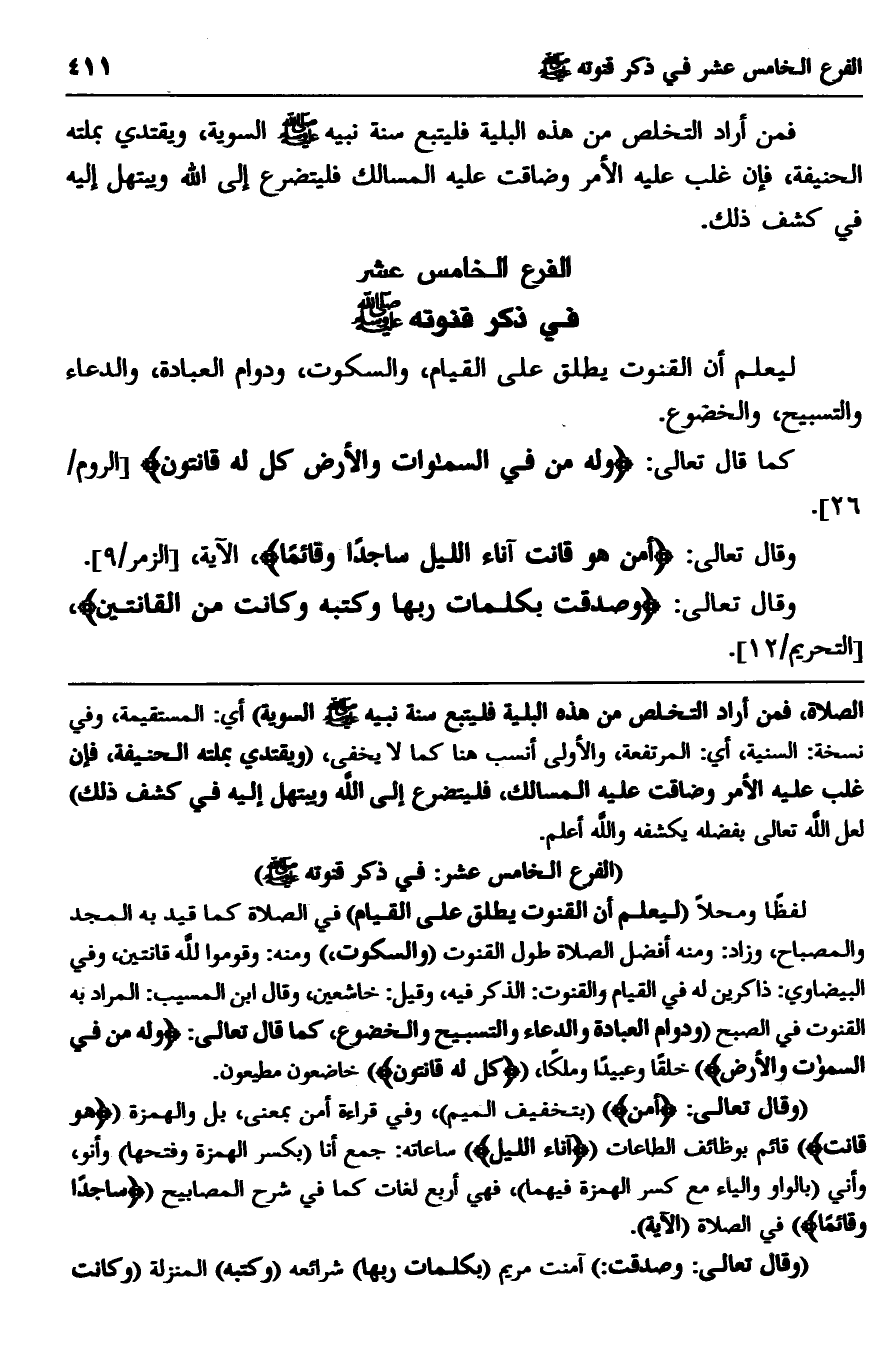 لفظا ومحلا "ليعلم أن القنوت يطلق على القيام" في الصلاة كما قيد به المجد والمصباح، وزاد: ومنه أفضل الصلاة طول القنوت "والسكوت" ومنه: {وَقُومُوا لِلَّهِ قَانِتِينَ} ، وفي البيضاوي: ذاكرين له في القيام, والقنوت: الذكر فيه، وقيل: خاشعين، وقال ابن المسيب: المراد به القنوت في الصبح "ودوام العبادة والدعاء والتسبيح والخضوع، كما قال تعالى: {وَلَهُ مَنْ فِي السَّمَاوَاتِ وَالْأَرْضِ} خلقا وعبيدا وملكا، {كُلٌّ لَهُ قَانِتُونَ} خاضعون مطيعون.