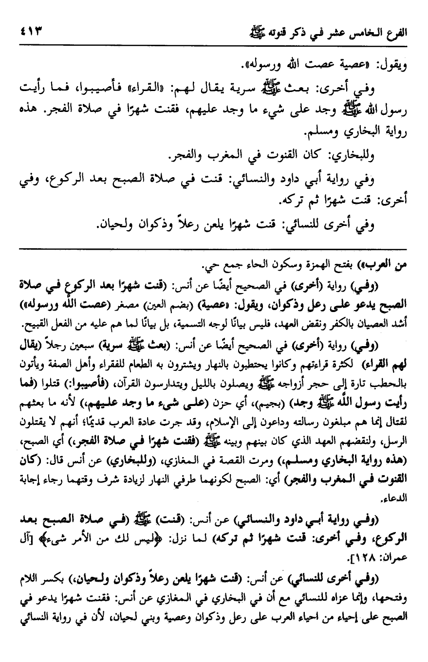 وفي أخرى: بعث صلى الله عليه وسلم سرية يقال لهم: "القراء" فأصيبوا، فما رأيت رسول الله صلى الله عليه وسلم وجد على شيء ما وجد عليهم، فقنت شهرا في صلاة الفجر. هذه رواية البخاري ومسلم.
