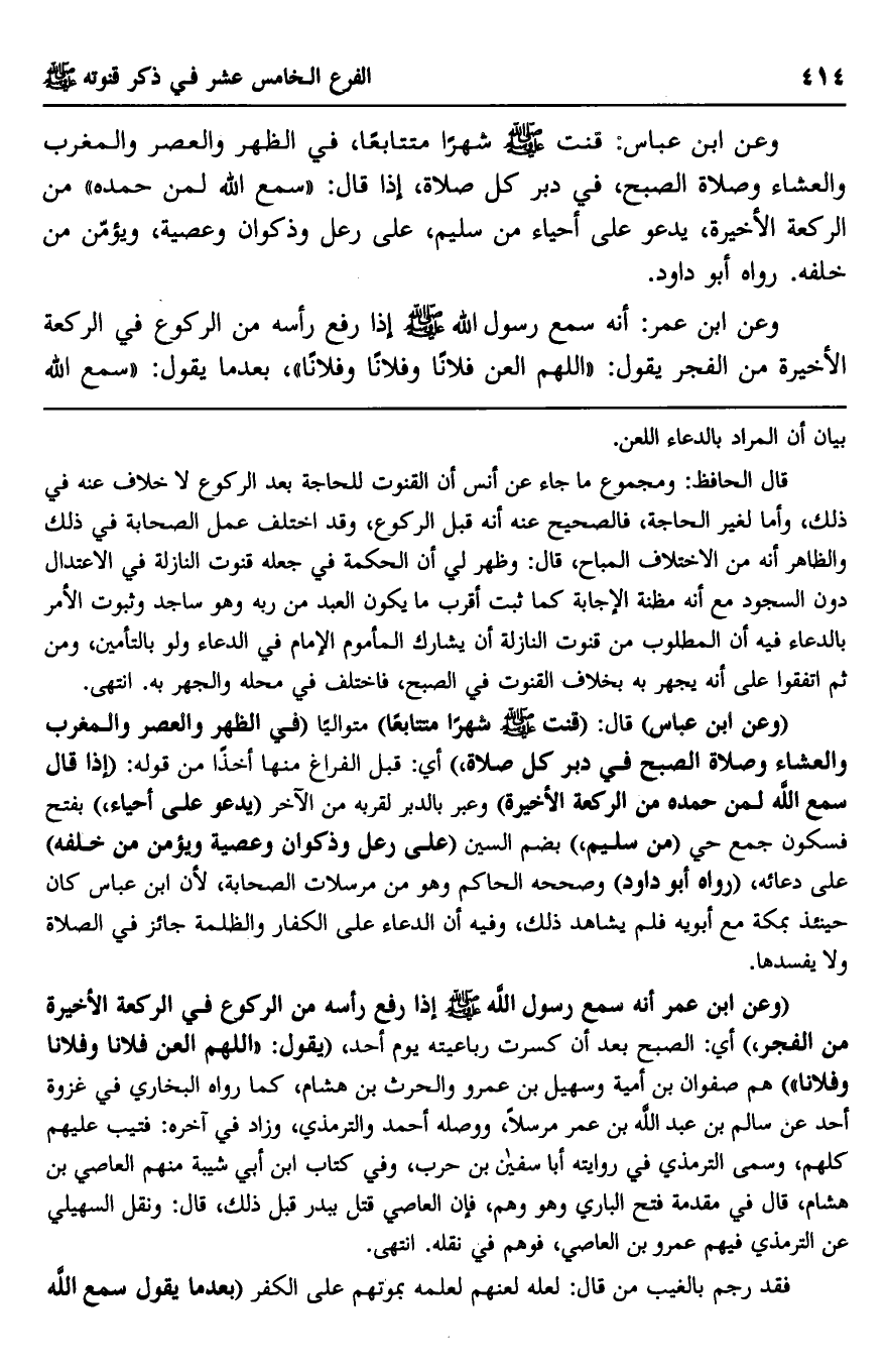 وعن ابن عمر: أنه سمع رسول الله صلى الله عليه وسلم إذا رفع رأسه من الركوع في الركعة الأخيرة من الفجر يقول: "اللهم اللعن فلانا وفلانا وفلانا" بعدما يقول: "سمع الله