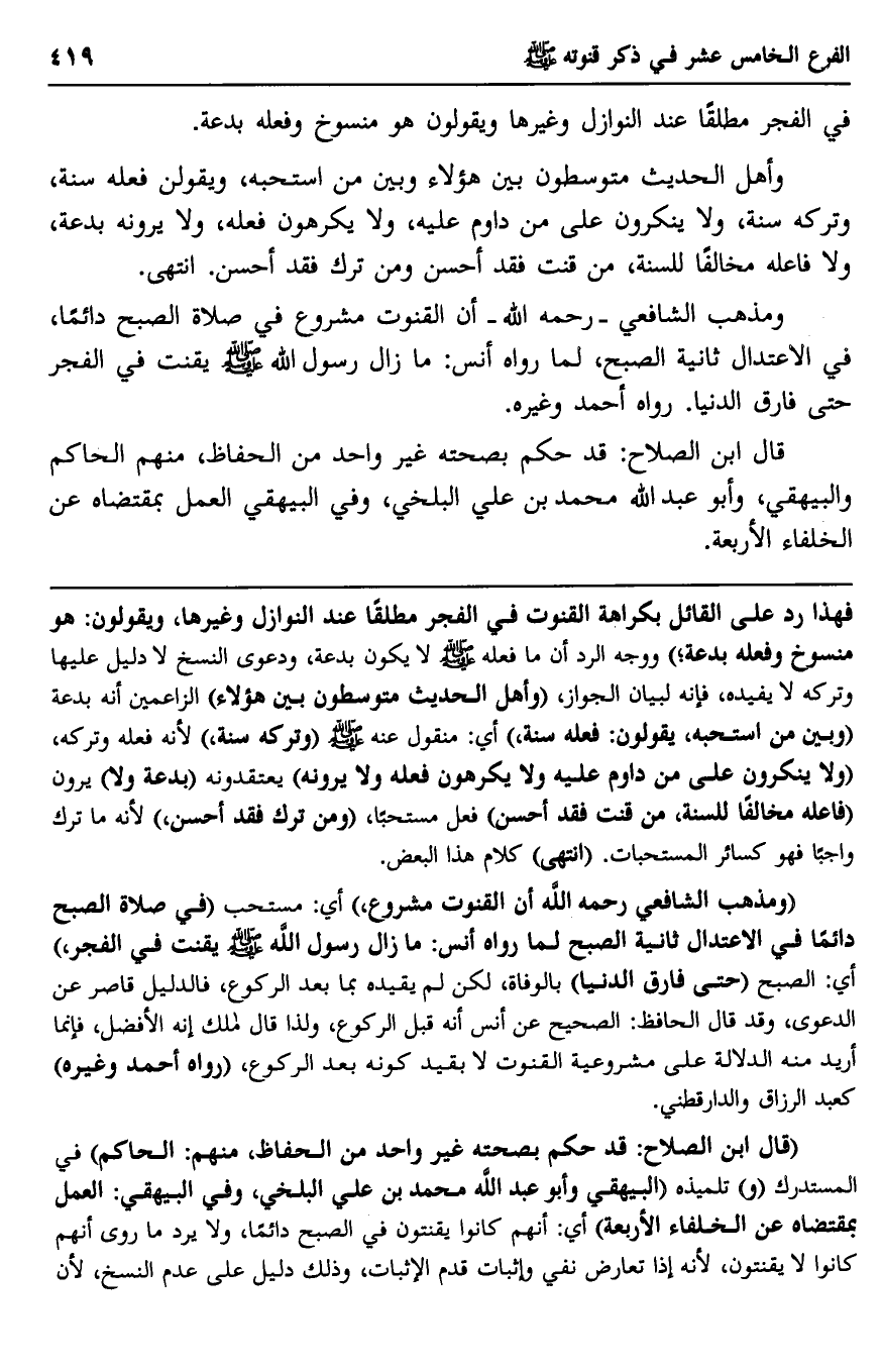 "قال ابن الصلاح: قد حكم بصحته غير واحد من الحفاظ، منهم: الحاكم" ف المستدرك "و" تلميذه "البيهقي وأبو عبد الله محمد بن علي البلخي، وفي البيهقي: العمل بمقتضاه عن الخلفاء الأربعة" أي: أنهم كانوا يقنتون في الصبح دائما، ولا يرد ما روي أنهم كانوا لا يقنتون، لأنه إذا تعارض نفي وإثبات قدم الإثبات، وذلك دليل على عدم النسخ، لأن
