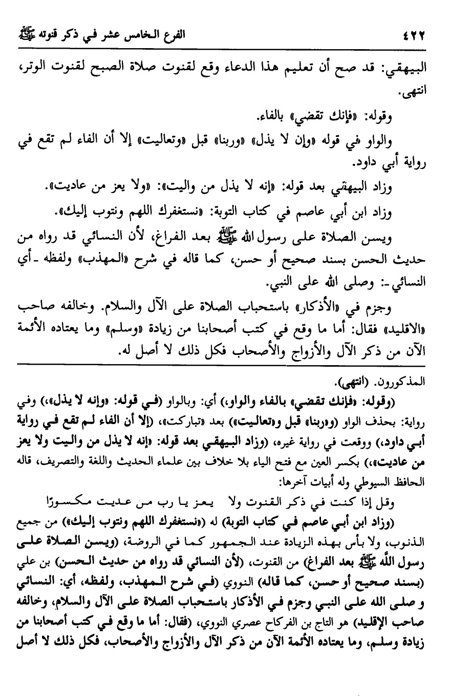 "وزاد ابن أبي عاصم في كتاب التوبة له": "نستغفرك اللهم ونتوب إليك". من جميع الذنوب، ولا بأس بهذه الزيادة عند الجمهور كما في الروضة، "ويسن الصلاة على رسول الله صلى الله عليه وسلم بعد الفراغ" من القنوت "لأن النسائي قد رواه من حديث الحسن" بن علي "بسند صحيح أو حسن، كما قاله" النووي "في شرح المهذب، ولفظه، أي: النسائي وصلى الله على النبي وجزم في الأذكار باستحباب الصلاة على الآل والسلام، وخالفه صاحب الإقليد" هو التاج بن الفركاح عصري النووي، "فقال: أما ما وقع في كتب أصحابنا من زيادة وسلم، وما يعتاده الأئمة الآن من ذكر الآل والأزواج والأصحاب، فكل ذلك لا أصل