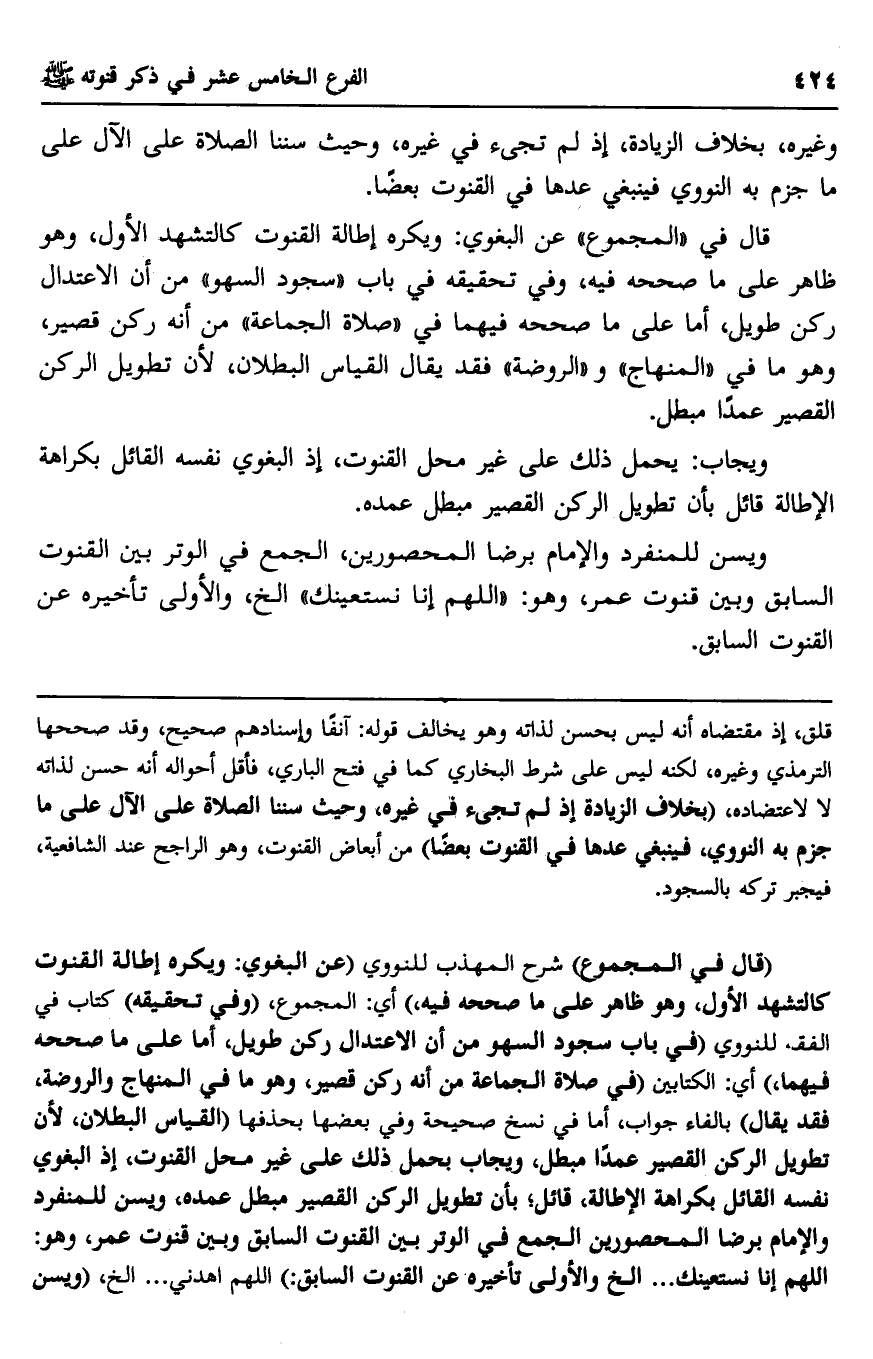 ويجاب: يحمل ذلك على غير محل القنوت، إذ البغوي نفسه القائل بكراهة الإطالة قائل بأن تطويل الركن القصير مبطل عمده.