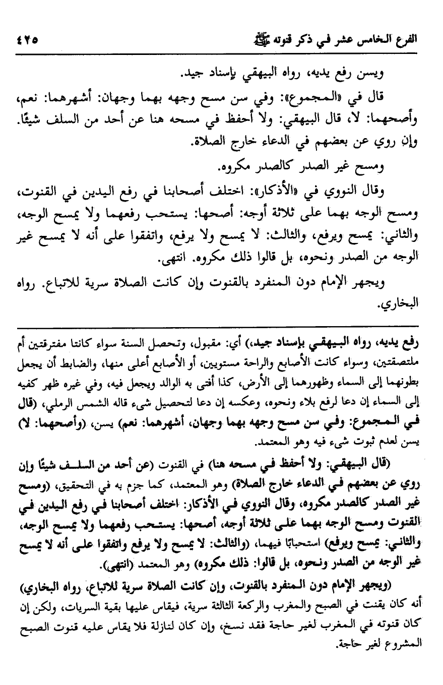 وقال النووي في "الأذكار": اختلف أصحابنا في رفع اليدين في القنوت، ومسح الوجه بهما على ثلاثة أوجه: أصحها: يستحب رفعهما ولا يمسح الوجه، والثاني: يمسح ويرفع، والثالث: لا يمسح ولا يرفع، واتفقوا على أنه لا يمسح غير الوجه من الصدر ونحوه، بل قالوا ذلك مكروه. انتهى.