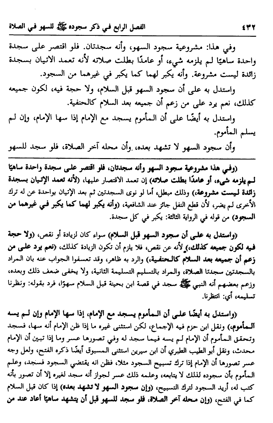 "واستدل به أيضا على أن المأموم يسجد مع الإمام، إذا سها الإمام وإن لم يسه المأموم، ونقل ابن حزم فيه الإجماع، لكن استثنى غيره ما إذا ظن الإمام أنه سها، فسجد وتحقق المأموم أن الإمام لم يسه فيما سجد له وفي تصورها عسر وما إذا تبين أن الإمام محدث، ونقل أبو الطيب الطبري أن ابن سيرين استثنى المسبوق أيضا ذكره الفتح، ولعل وجه عسر تصورها أن الإمام إذا ترك تسبيح السجود مثلا، فظن أنه يقتضي السجود فسجد، وعلم المأموم بأن سجوده لذلك لا يتابعه، وعلمه ذلك عسر لجواز أنه سجد لغيره إلا أن تصور بأنه كتب له، أريد السجود لترك التسبيح، "وإن سجود السهو لا تشهد بعده" إذا كان قبل السلام كما في الفتح، "وإن محله آخر الصلاة، فلو سجد للسهو قبل أن يتشهد ساهيا أعاد عند من