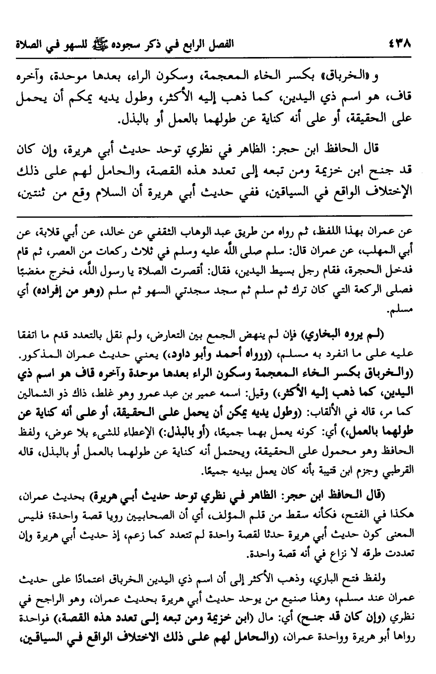 "قال الحافظ ابن حجر: الظاهر في نظري توحد حديث أبي هريرة" بحديث عمران، هكذا في الفتح، فكأنه سقط من قلم المؤلف، أي أن الصحابيين رويا قصة واحدة، فليس المعنى كون حديث أبي هريرة حديثا لقصة واحدة لم تتعدد كما زعم، إذ حديث أبي هريرة وإن تعددت طرقه لا نزاع في أنه قصة واحدة.