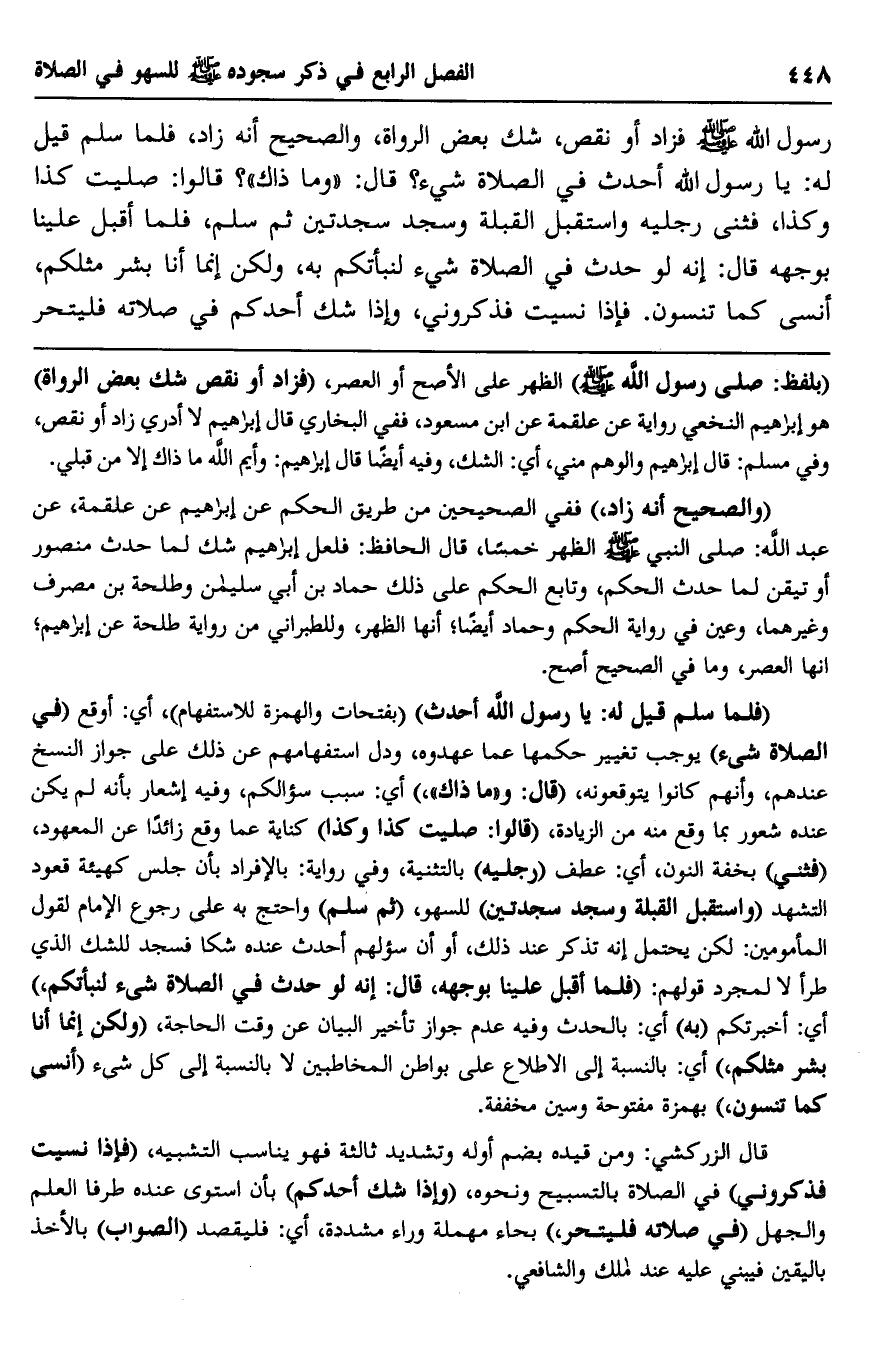 رسول الله صلى الله عليه وسلم فزاد أو نقص، شك بعض الرواة، والصحيح أنه زاد، فلما سلم قيل له: يا رسول الله أحدث في الصلاة شيء؟ قال: "وما ذاك"؟ قالا: صليت كذا وكذا، فثنى رجليه واستقبل القبلة وسجد سجدتين ثم سلم، فلما أقبل علينا بوجهه قال: "إنه لو حدث في الصلاة شيء لنبأتكم به، ولكن إنما أنا بشر مثلكم، أنسى كما تنسون, فإذا نسيت فذكروني، وإذا شك أحدكم في صلاته فليتحر