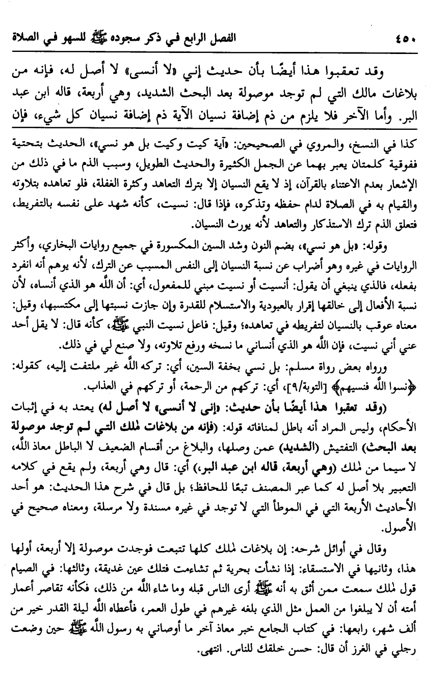 "وقد تعقبوا هذا أيضا بأن حديث: "إني لا أنسى" لا أصل له" يعتد به في إثبات الأحكام، وليس المراد أنه باطل لمنافاته قوله: "فإنه من بلاغات مالك التي لم توجد موصولة بعد البحث" التفتيش "الشديد" عمن وصلها، والبلاغ من أقسام الضعيف لا الباطل معاذ الله، لا سيما من مالك "وهي أربعة، قاله ابن عبد البر" أي: قال وهي أربعة، ولم يقع في كلامه التعبير بلا أصل له كما عبر المصنف تبعا للحافظ، بل قال في شرح هذا الحديث: هو أحد الأحاديث الأربعة التي في الموطأ التي لا توجد في غيره مسندة ولا مرسلة، ومعناه صحيح في الأصول.