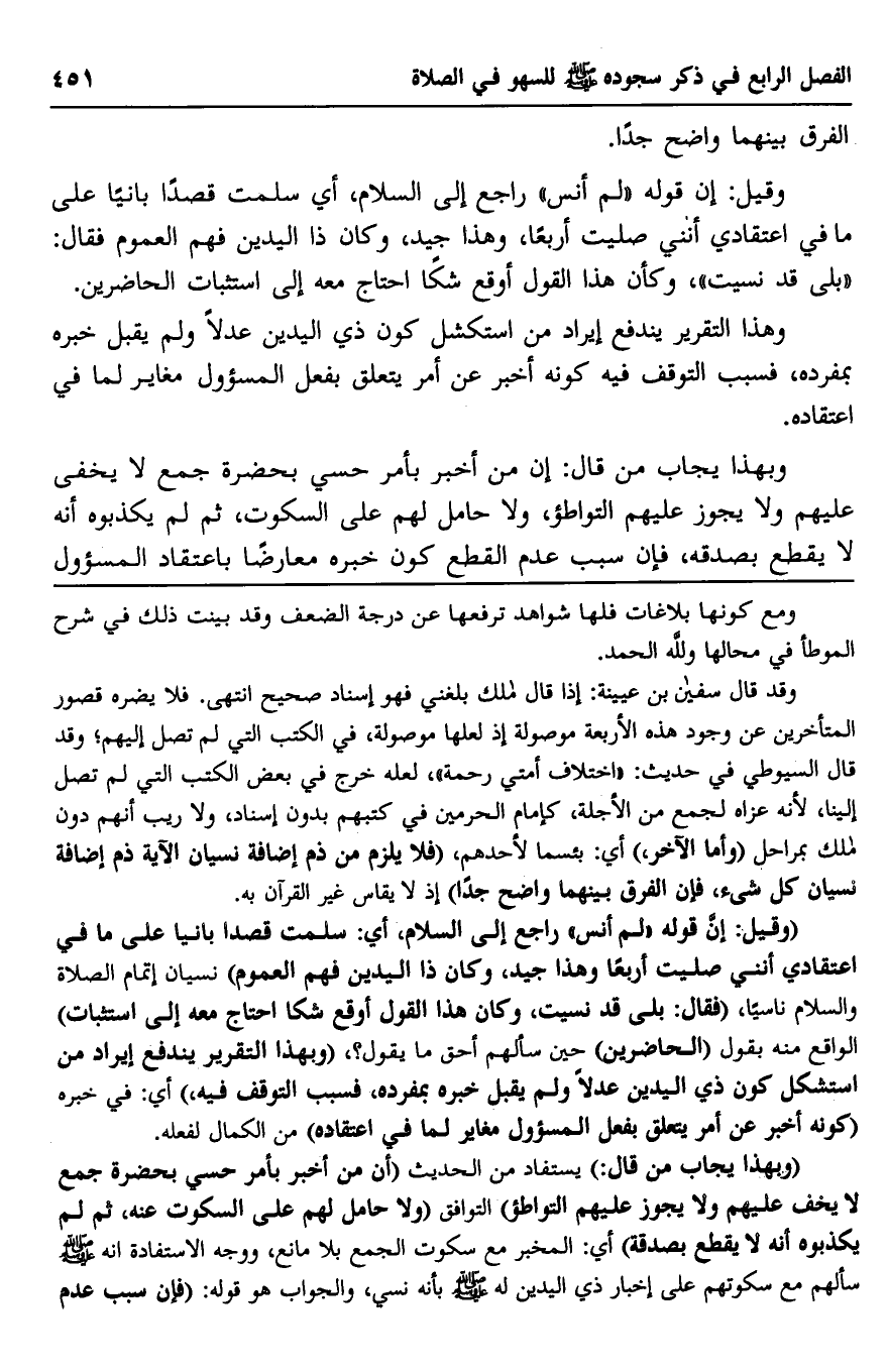 "وقيل: إن قوله "لم نس" راجع إلى السلام، أي: سلمت قصدا بانيا على ما في اعتقادي أنني صليت أربعا وهذا جيد، وكان ذا اليدين فهم العموم" نسيان إتمام الصلاة والسلام ناسيا، "فقال: بلى قد نسيت، وكان هذا القول أوقع شكا احتاج معه إلى استثبات" الواقع منه بقول "الحاضرين" حين سألهم أحق ما يقول؟ "وبهذا التقرير يندفع إيراد من استشكل كون ذي اليدين عدلا ولم يقبل خبره بمفرده، فسبب التوقف فيه" أي: في خبره "كونه أخبر عن أمر يتعلق بفعل المسئول مغاير لما في اعتقاده" من الكمال لفعله.