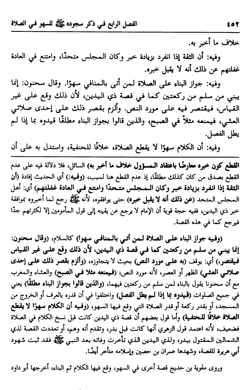 "وفيه جواز البناء على الصلاة لمن أتي بالمنافي سهوا" كالسلام، "وقال سحنون: إنما يبني من سلم من ركعتين كما في قصة ذي اليدين، لأن ذلك وقع على غير القياس فيقتصر" أي: يوقف "به على مورد النص" بحيث لا يتجاوزه، "وألزم بقصر ذلك على إحدى صلاتي العشي" الظهر أو العصر، لأنه مورد النص، "فيمنعه مثلا في الصبح" والعشاء والمغرب مع أن سحنونا يقول بالبناء لمن سلم من ركعتين فيهما، "والذين قالوا بجواز البناء مطلقا" يعني في جميع الصلوات "قيدوه بما إذا لم يطل الفصل" واختلفوا في أن قدره بالعرف أو الخروج من المسجد، أو بقدر ركعة أو قدر الصلاة التي وقع فيها السهو، "وفيه أن الكلام سهوا لا يقطع الصلاة خلافا للحنفية" وأما قول بعضهم أن قصة ذي اليدين كانت قبل نسخ الكلام في الصلاة فضعيف، لأنه اعتمد قول الزهري أنها كانت قبل بدر، وتقدم أنه وهم، أو تعددت القصة لذي الشمالين المقتول ببدر، ولذي اليدين الذي تأخرت وفاته بعد النبي صلى الله عليه وسلم فقد ثبت شهود أبي هريرة للقصة، وشهدها عمران بن حصين وإسلامه متأخر أيضا.