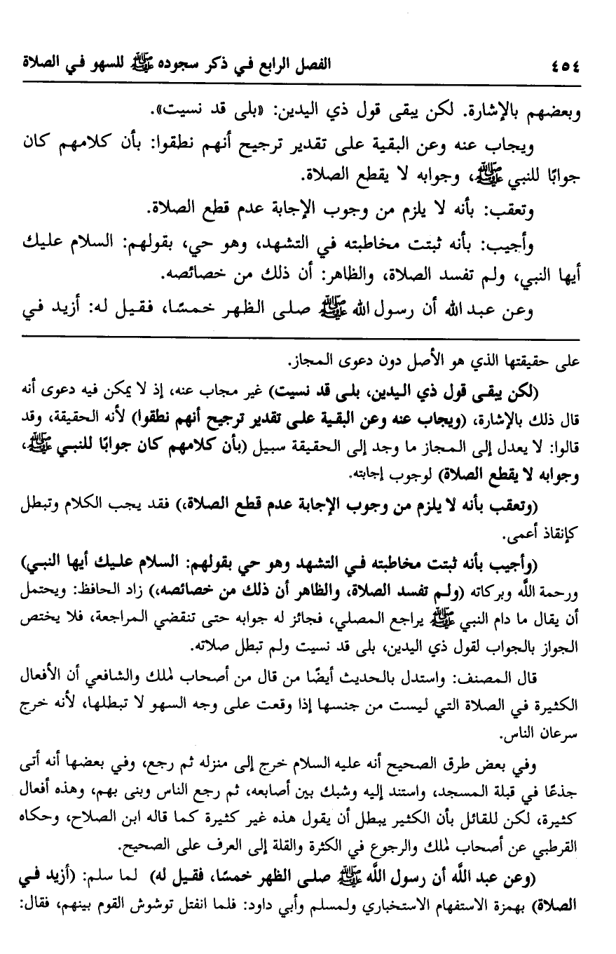 "لكن يبقى قول ذي اليدين، بلى قد نسيت" غير مجاب عنه، إذ لا يمكن فيه دعوى أنه قال ذلك بالإشارة، "ويجاب عنه وعن البقية على تقدير ترجيح أنهم نطقوا" لأنه الحقيقة، وقد قالوا: لا يعدل إلى المجاز ما وجد إلى الحقيقة سبيل "بأن كلامهم كان جوابا للنبي صلى الله عليه وسلم وجوابه لا يقطع الصلاة" لوجوب إجابته.