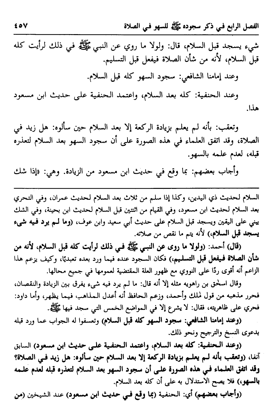 "وعند إمامنا الشافعي: سجود السهو كله قبل السلام" وتعسفوا له الجواب عما ورد قبله بدعوى النسخ والترجيح ونحو ذلك.