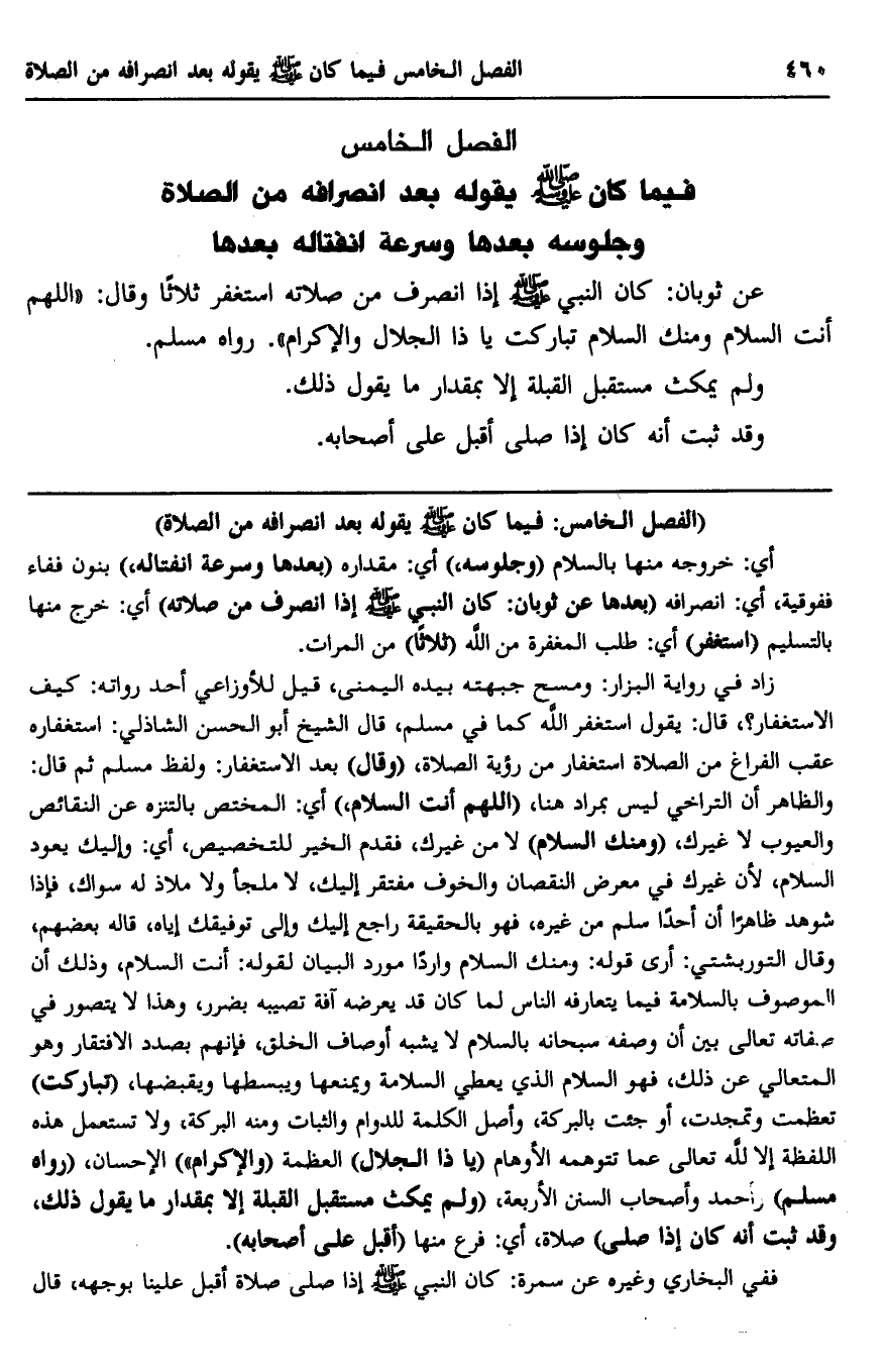 الفصل الخامس: فيما كان صلى الله عليه وسلم يقوله بعد انصرافه من الصلاة