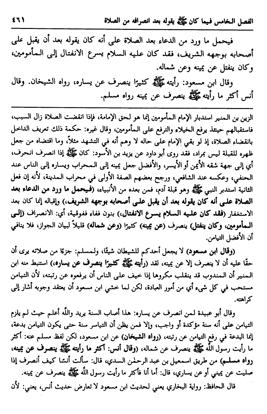 وقال ابن مسعود: رأيته صلى الله عليه وسلم كثيرا ينصرف عن يساره، رواه الشيخان. وقال أنس أكثر ما رأيته صلى الله عليه وسلم ينصرف عن يمينه رواه مسلم.