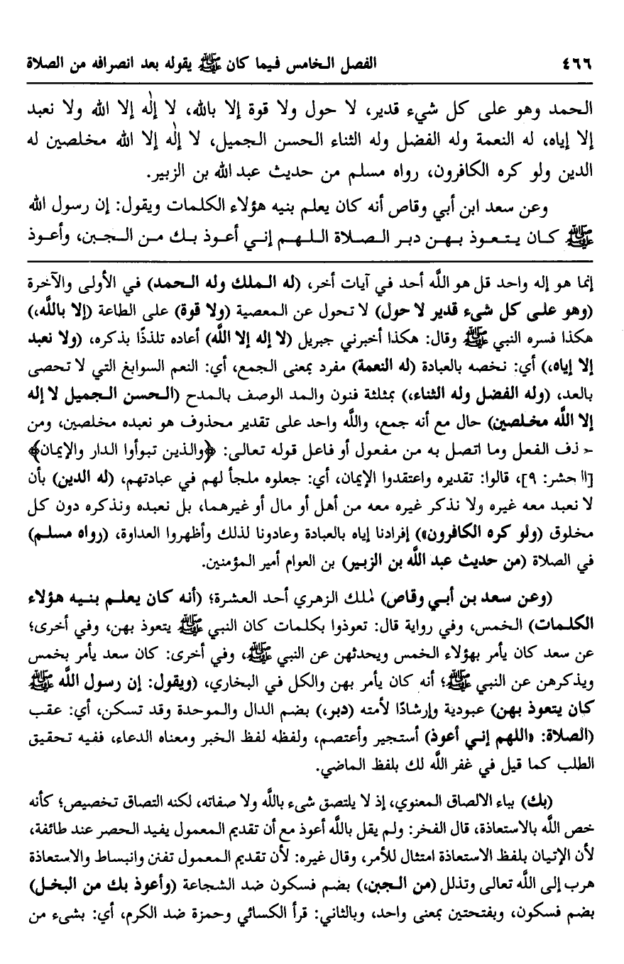 "وعن سعد بن أبي وقاص" مالك الزهري أحد العشرة، "أنه كان يعلم بنيه هؤلاء الكلمات" الخمس، وفي رواية قال: تعوذوا بكلمات كان النبي صلى الله عليه وسلم يتعوذ بهن، وفي أخرى، عن سعد كان يأمر بهؤلاء الخمس ويحدثهن عن النبي صلى الله عليه وسلم وفي أخرى: كان سعد يأمر بخمس ويذكرهن عن النبي صلى الله عليه وسلم أنه كان يأمر بهن والكل في البخاري، "ويقول: إن رسول الله صلى الله عليه وسلم كان يتعوذ بهن" عبودية وإرشادا لأمته "دبر" بضم الدال والموحدة وقد تسكن، أي: عقب "الصلاة": "اللهم إني أعوذ" أستجير وأعتصم، ولفظه لفظ الخبر ومعناه الدعاء، ففيه تحقيق الطلب كما قيل في غفر الله لك بلفظ الماضي.