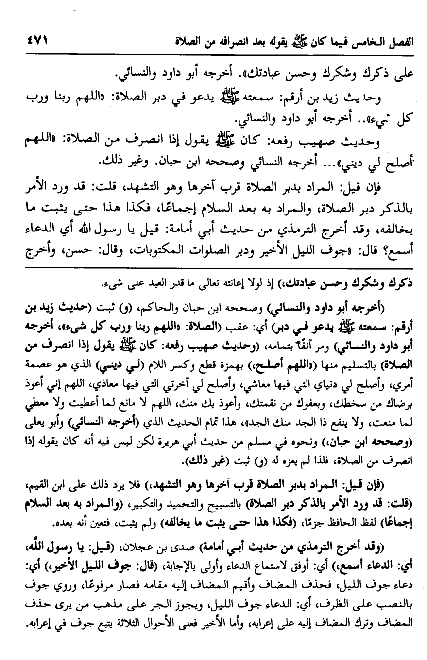 وحديث صهيب رفعه: كان صلى الله عليه وسلم يقول إذا انصرف من الصلاة: "اللهم أصلح لي ديني". أخرجه النسائي وصححه ابن حبان. وغير ذلك.