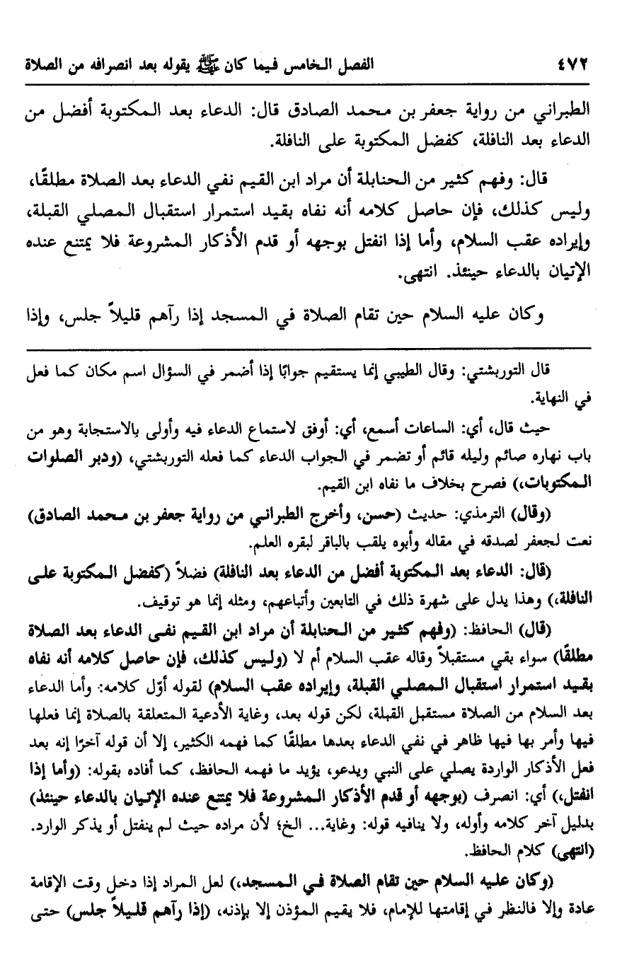 "قال" الحافظ: "وفهم كثير من الحنابلة أن مراد ابن القيم نفي الدعاء بعد الصلاة مطلقا" سواء بقي مستقبلا وقاله عقب السلام أم لا "وليس كذلك، فإن حاصل كلامه أنه نفاه بقيد استمرار استقبال المصلي القبلة، وإيراده عقب السلام" لقوله أول كلامه: وأما الدعاء بعد السلام من الصلاة مستقبل القبلة، لكن قوله بعد، وغاية الأدعية المتعلقة بالصلاة إنما فعلها فيها وأمر بها فيها ظاهر في نفس الدعاء بعدها مطلقا كما فهمه الكثير، إلا أن قوله آخرا إنه بعد فعل الأذكار الواردة يصلي على النبي ويدعو، يؤيد ما فهمه الحافظ، كما أفاده بقوله: "وأما إذا انفتل" أي: انصرف "بوجهه أو قدم الأذكار المشروعة فلا يمتنع عنده الإتيان بالدعاء حينئذ" بدليل آخر كلامه وأوله، ولا ينافيه قوله: وغاية ... إلخ، لأن مراده حيث لم ينفتل أو يذكر الوارد. "انتهى" كلام الحافظ.