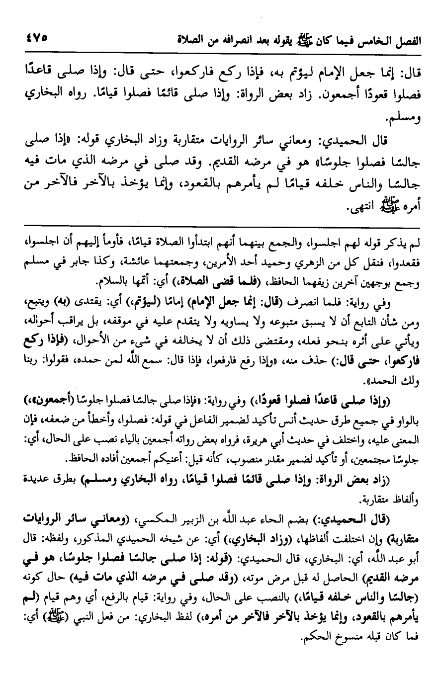 قال الحميدي: ومعاني سائر الروايات متقاربة وزاد البخاري قوله: "إذا صلى جالسا فصلوا جلوسا" هو في مرضه القديم. وقد صلى في مرضه الذي مات فيه جالسا والناس خلفه قياما لم يأمرهم بالقعود، وإنما يؤخذ بالآخر فالآخر من أمره صلى الله عليه وسلم. انتهى.