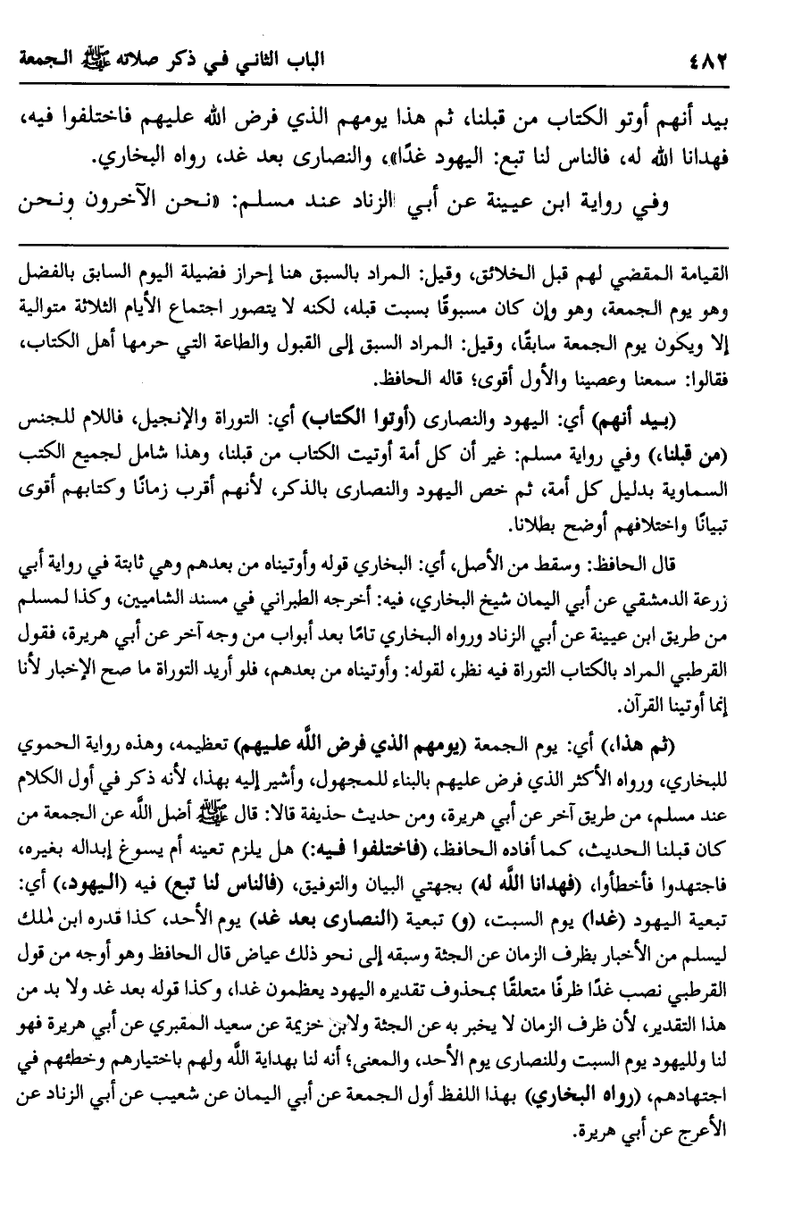 بيد أنهم أوتوا الكتاب من قبلنا، ثم هذا يومهم الذي فرض الله عليهم فاختلفوا فيه، فهدانا الله له، فالناس لنا تبع: اليهود غدا والنصارى بعد غد". رواه البخاري.