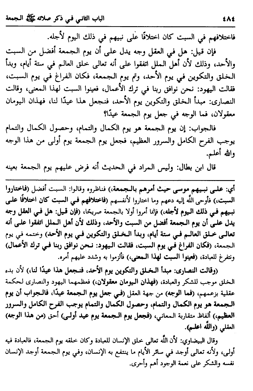 "وقالت النصارى: مبدأ الخلق والتكوين يوم الأحد، فنجعل هذا عيدا لنا" لأن بدء الخلق موجب للشكر والعبادة، "فهذان اليومان معقولان" فعظمهما اليهود والنصارى لحكمة عقلية بزعمهم، "فما الوجه" من جهة العقل "في جعل يوم الجمعة عيدا، فالجواب أن يوم الجمعة هو يوم الكمال والتمام، وحصول الكمال والتمام يوجب الفرح الكامل والسرور العظيم،" ألفاظ متقاربة المعاني، "فجعل يوم الجمعة يوم عيد أولى" أحق "من هذا الوجه" العقلي "والله أعلم".