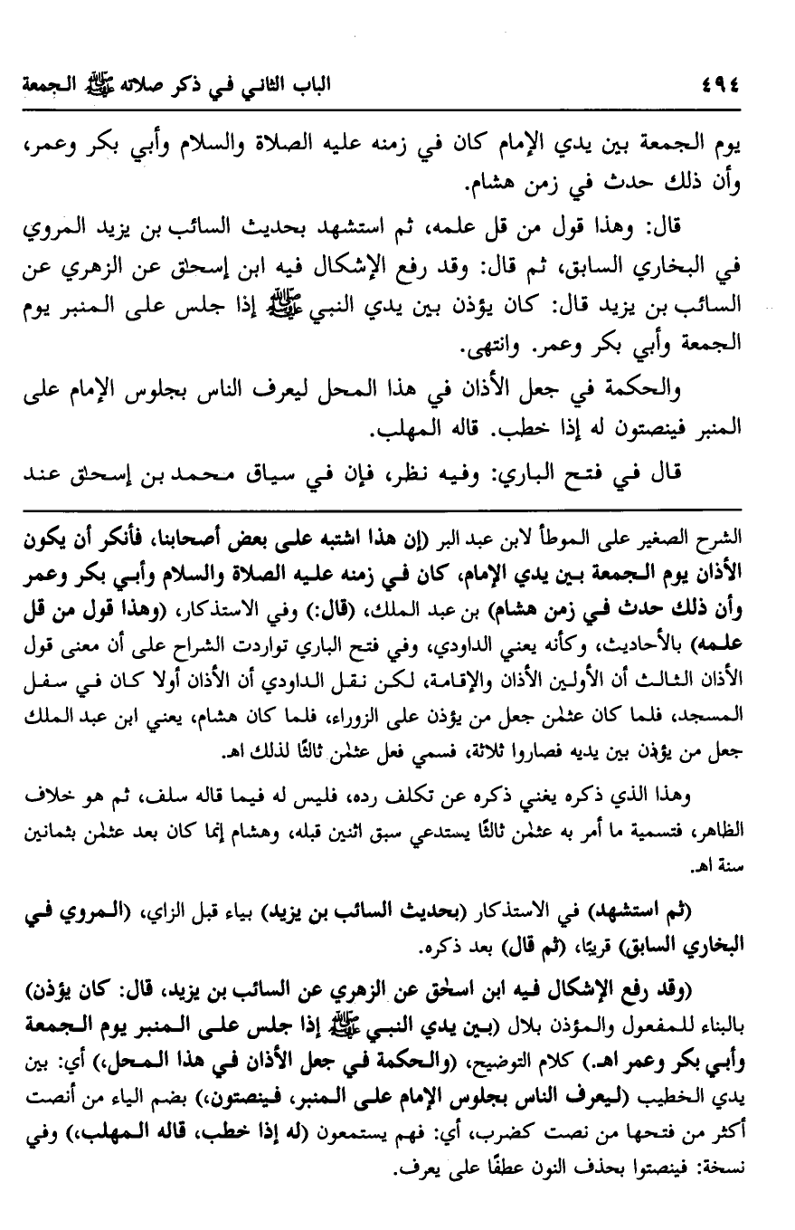 الشرح الصغير على الموطأ لابن عبد البر "إن هذا اشتبه على بعض أصحابنا، فأنكر أن يكون الأذان يوم الجمعة بين يدي الإمام، كان في زمنه عليه الصلاة والسلام وأبي بكر وعمر وأن ذلك حدث في زمن هشام" بن عبد الملك "قال" وفي الاستذكار، "وهذا قول من قل علمه" بالأحاديث، وكأنه يعني الداودي، وفي فتح الباري تواردت الشراح على أن معنى قول الأذان الثالث أن الأولين الأذان والإقامة، لكن نقل الداودي أن الأذان أولا كان في سفل المسجد، فلما كان عثمان جعل من يؤذن على الزوراء، فلما كان هشام، يعني ابن عبد الملك جعل من يؤذن بين يديه فصاروا ثلاثة، فسمي فعل عثمان ثالثا لذلك. ا. هـ.
