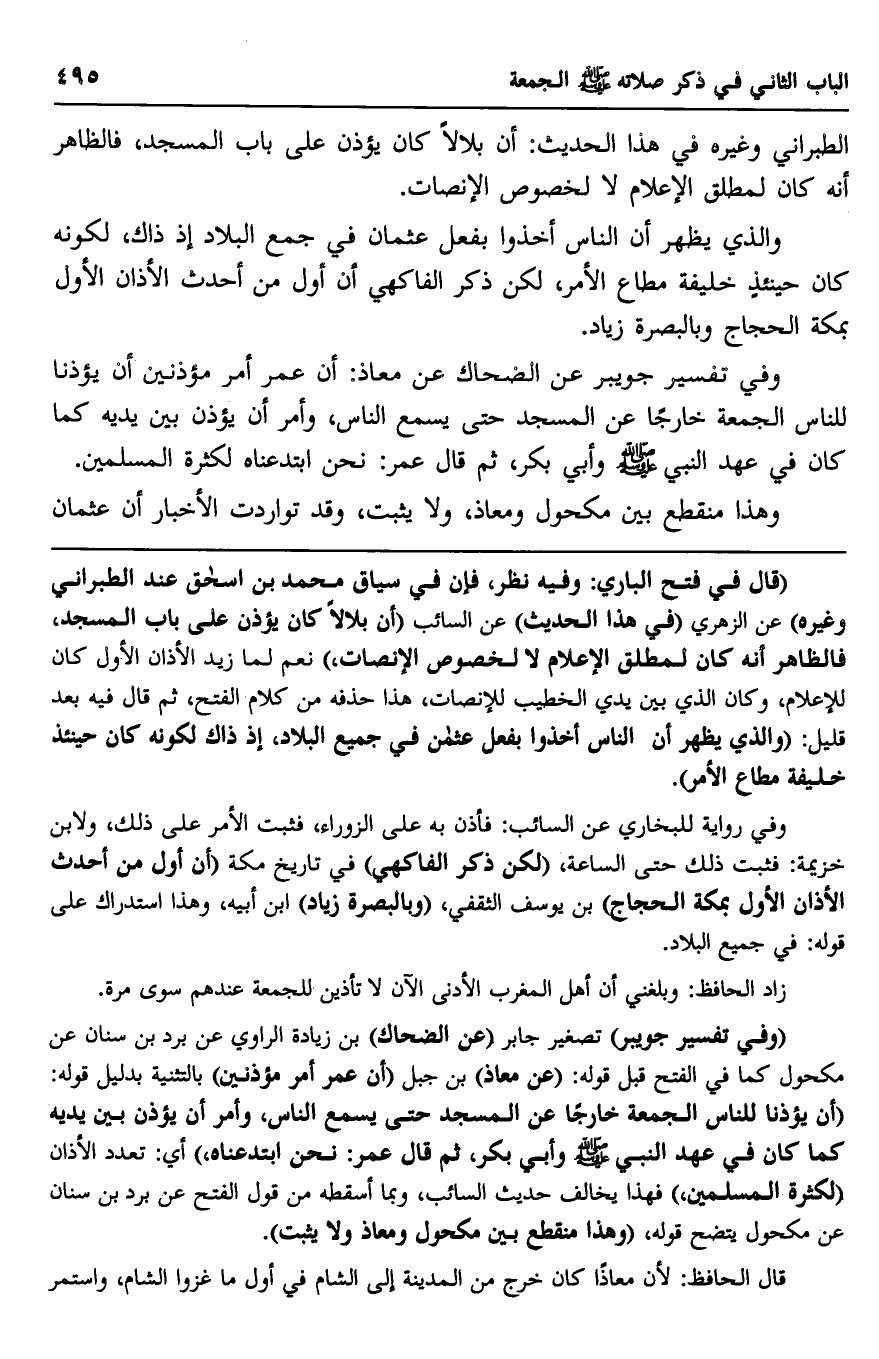 "وفي تفسير جويبر" تصغير جابر "عن الضحاك" بن زياد الراوي عن برد بن سنان عن مكحول كما في الفتح قبل قوله: "عن معاذ" بن جبل "أن عمر أمر مؤذنين" بالتثنية بدليل قوله: "أن يؤذنا للناس الجمعة خارجا عن المسجد حتى يسمع الناس، وأمر أن يؤذن بين يديه كما كان في عهد النبي صلى الله عليه وسلم وأبي بكر، ثم قال عمر: نحن ابتدعناه" أي: تعدد الأذان "لكثرة المسلمين" فهذا يخالف حديث السائب، وبما أسقطه من قول الفتح عن برد بن سنان عن مكحول يتضح قوله، "وهذا منقطع بين مكحول ومعاذ ولا يثبت".