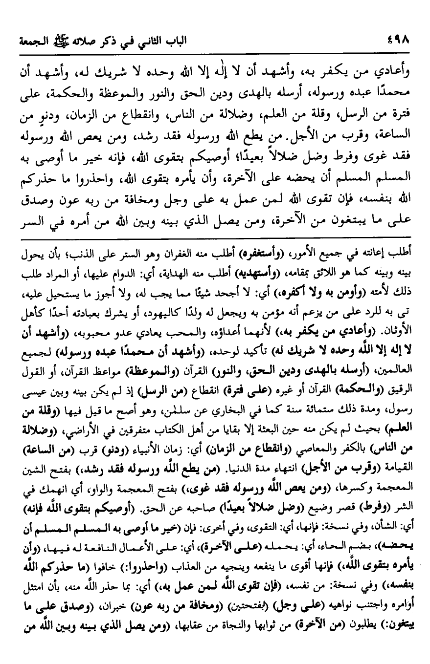 أطب إعانته في جميع الأمور، "وأستغفره" أطلب منه الغفران وهو الستر على الذنب، بأن يحول بينه وبينه كما هو اللائق بمقامه، "وأستهديه" أطلب منه الهداية، أي: الدوام عليها، أو المراد طلب ذلك لأمته، "وأومن به ولا أكفره" أي لا أجحد شيئا مما يجب له، ولا أجوز ما يستحيل عليه، أتى به للرد على من يزعم أنه مؤمن به ويجعل له ولدا كاليهود، أو يشرك بعبادته أحدًا كأهل الأوثان. "وأعادي من يكفر به" لأنهما أعداؤه، والمحب يعادي عدو محبوبه، "وأشهد أن لا إله إلا الله وحده لا شريك له" تأكيد لوحده، "وأشهد أن محمدًا عبده ورسوله" لجميع العالمين، "أرسله بالهدى ودين الحق، والنور" القرآن "والموعظة" مواعظ القرآن، أو القول الرقيق "والحكمة" القرآن أو غيره "على فترة" انقطاع "من الرسل" إذ لم يكن بينه وبين عيسى رسول، ومدة ذلك ستمائة سنة كما في البخاري عن سلمان، وهو أصح ما قيل فيها "وقلة من العلم" بحيث لم يكن منه حين البعثة إلا بقايا من أهل الكتاب متفرقين في الأراضي، "وضلالة من الناس" بالكفر والمعاصي "وانقطاع من الزمان" أي: زمان الأنبياء "ودنو" قرب "من الساعة" القيامة "وقرب من الأجل" انتهاء مدة الدنيا. "من يطع الله ورسوله فقد رشد" بفتح الشين المعجمة وكسرها، "ومن يعص الله ورسوله فقد غوى" بفتح المعجمة والواو، أي انهمك في الشر "وفرط" قصر وضيع "وضل ضلالا بعيدا" صاحبه عن الحق. "أوصيكم بتقوى الله فإنه" أي: الشأن، وفي نسخة: فإنها أي: التقوى، وفي أخرى: فإن "خير ما أوصى به المسلم المسلم أن يحضه" بضم الحاء، أي: يحمله "على الآخرة" أي: على الأعمال النافعة له فيها، "وأن يأمره بتقوى الله" فإنها أقوى ما ينفعه وينجيه من العذاب "واحذورا" خافوا "ما حذركم الله بنفسه" وفي نسخة: من نفسه "فإن تقوى الله لمن عمل به" أي: بما حذر الله منه، بأن امتثل أوامره واجتنب نواهيه "على وجل"، "بفتحتين" "ومخافة من ربه عون" خبران، "وصدق على ما يبتغون" يطلبون "من الآخرة" من ثوابها والنجاة من عقابها، "ومن يصل الذي بينه وبين الله من