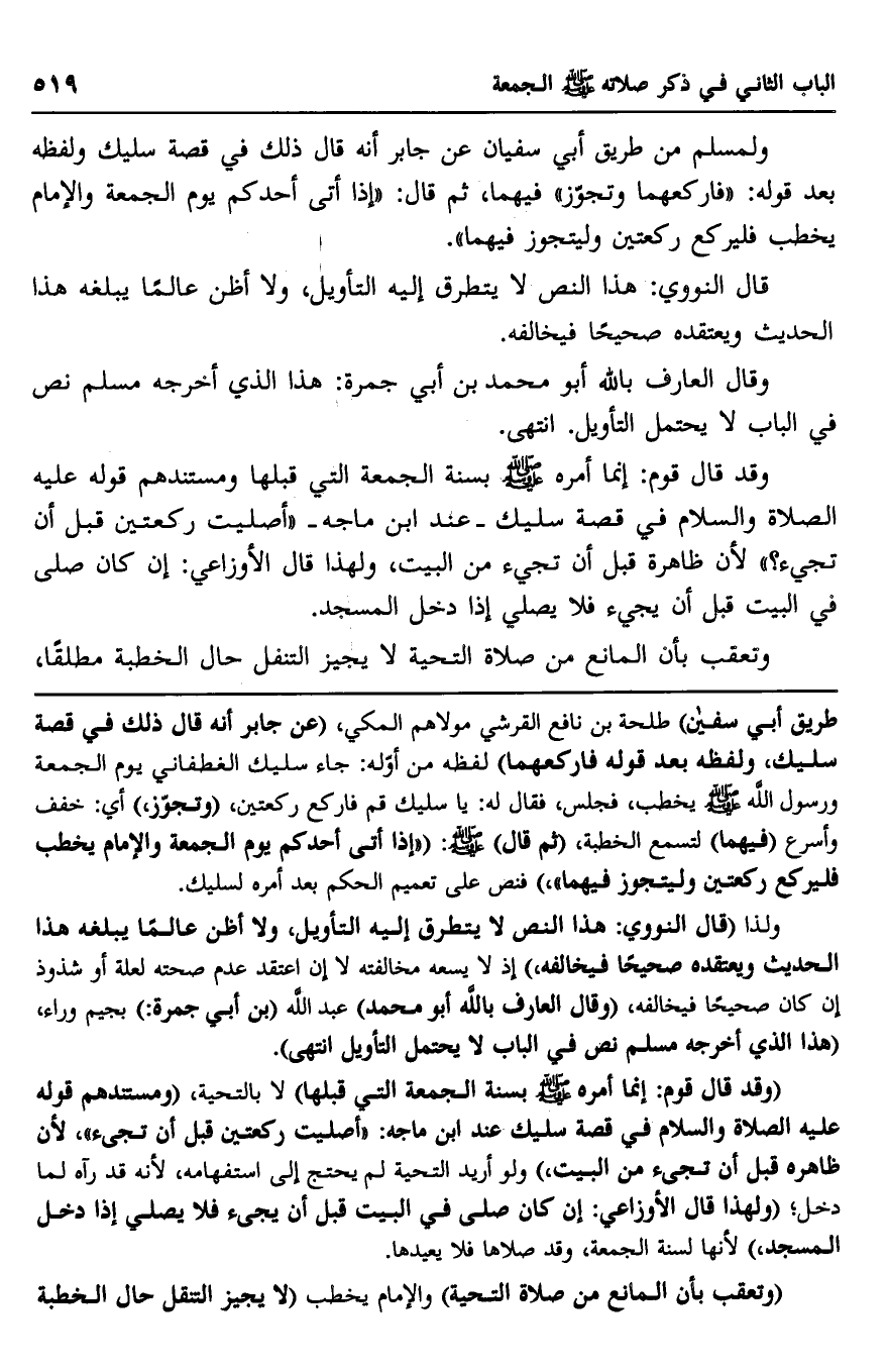 طريق أبي سفيان" طلحة بن نافع القرشي مولاهم المكي، "عن جابر أنه قال ذلك في قصة سليك، ولفظه بعد قوله فاركعهما" لفظه من أوله: جاء سليك الغطفاني يوم الجمعة ورسول الله صلى الله عليه وسلم يخطب، فجلس، فقال له: "يا سليك قم فاركع ركعتين". "وتجوز" أي: خفف وأسرع "فيهما" لتسمع الخطبة، "ثم قال" صلى الله عليه وسلم: "إذا أتى أحدكم يوم الجمعة والإمام يخطب فليركع ركعتين وليتجوز فيهما". فنص على تعميم الحكم بعد أمره لسليك.