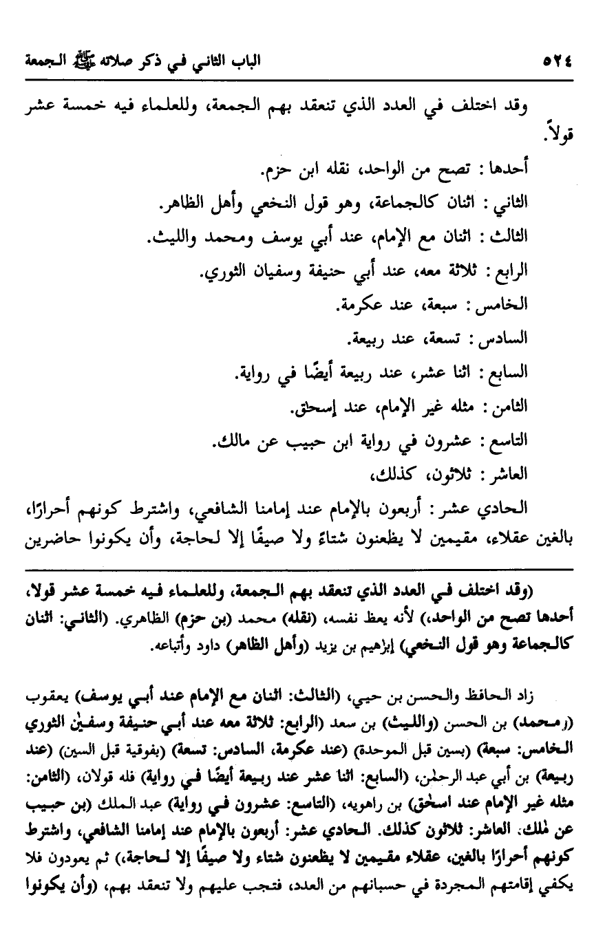 زاد الحافظ والحسن بن حيي، "الثالث: اثنان مع الإمام عند أبي يوسف" يعقوب "محمد" بن الحسن "والليث" بن سعد "الرابع: ثلاثة معه عند أبي حنيفة وسفيان الثوري الخامس: سبعة"، "بسين قبل الموحدة"، "عند عكرمة، السادس: تسعة" بفوقية قبل السين "عند ربيعة" بن أبي عبد الرحمن، "السابع: اثنا عشر عند ربيعة أيضا في رواية" فله قولان. "الثامن: مثله غير الإمام عند إسحاق" بن راهويه، "التاسع: عشرون في رواية" عبد الملك "بن حبيب عن مالك. العاشر: ثلاثون كذلك. الحادي عشر: أربعون بالإمام عند إمامنا الشافعي، واشترط كونهم أحرارا بالغين، عقلاء مقيمين لا يظعنون شتاء ولا صيفا إلا لحاجة" ثم يعودون فلا يكفي إقامتهم المجردة في حسبانهم من العدد، فتجب عليهم ولا تنعقد بهم، "وأن يكونوا
