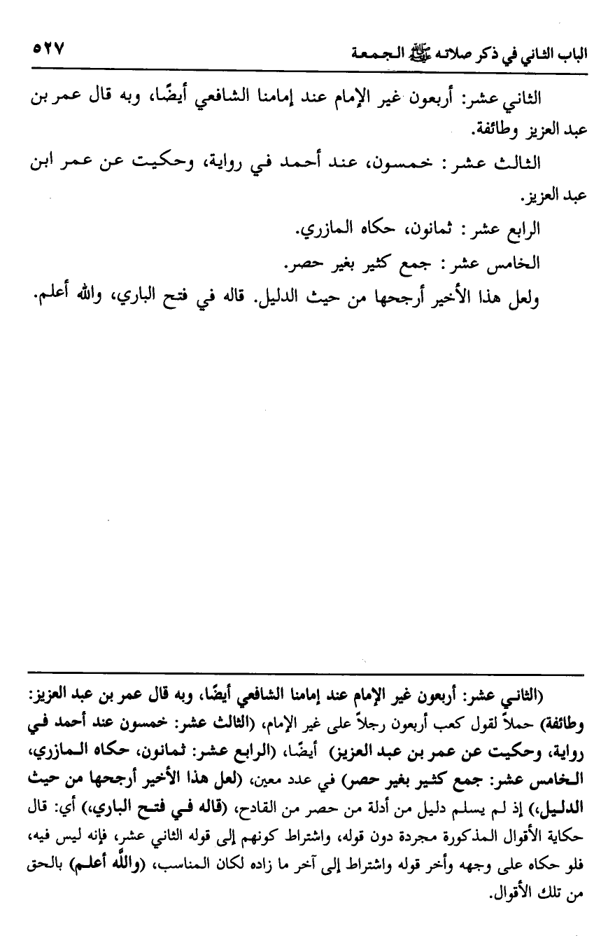 "الثاني عشر: أربعون غير الإمام عند إمامنا الشافعي أيضا، وبه قال عمر بن عبد العزيز: وطائفة" حملا لقول كعب أربعون رجلا على غير الإمام، "الثالث عشر: خمسون عند أحمد في رواية، وحكيت عن عمر بن عبد العزيز" أيضا، "الرابع عشر: ثمانون، حكاه المازري، الخامس عشر: جمع كثير بغير حصر" في عدد معين، "لعل هذا الأخير أرجحها من حيث الدليل" إذ لم يسلم دليل من أدلة من حصر من القادح، "قاله في فتح الباري" أي: قال حكاية الأقوال المذكورة مجردة دون قوله، واشتراط كونهم إلى قوله الثاني عشر، فإنه ليس فيه، فلو حكاه على وجهه وأخر قوله واشتراط إلى آخر ما زاده لكان المناسب، "والله أعلم" بالحق من تلك الأقوال.