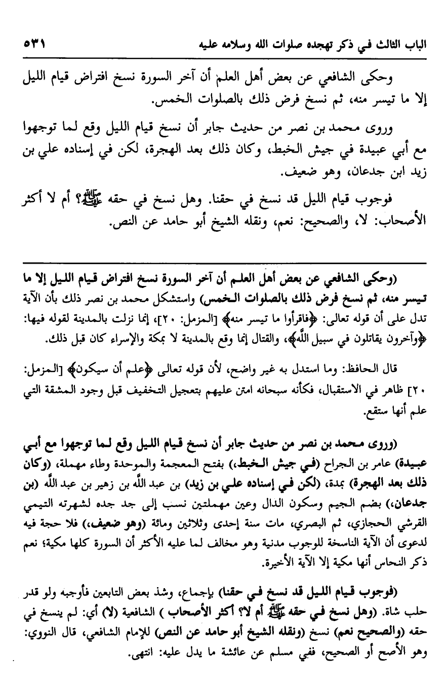 فوجوب قيام الليل قد نسخ في حقنا. وهل نسخ في حقه صلى الله عليه وسلم؟ أم لا؟ أكثر الأصحاب: لا، والصحيح: نعم، ونقله الشيخ أبو حامد عن النص.