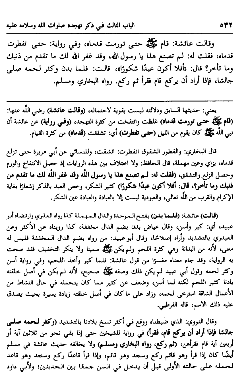 قال البخاري: والفطور الشقوق انفطرت: انشقت، وللنسائي عن أبي هريرة حتى تزلع قدماه، بزاي وعين مهملة، قال الحافظ: ولا اختلاف بين هذه الروايات إذ حصل الانتفاخ والورم وحصل الزلع والتشقق، "فقلت له: لم تصنع هذا يا رسول الله وقد غفر الله لك ما تقدم من ذنبك وما تأخر؟ قال: "أفلا أكون عبدا شكورا". كثير الشكر، وخص العبد بالذكر إشعارا بغاية الإكرام والقرب من الله تعالى، والعبودية ليست إلا بالعبادة والعبادة عين الشكر.