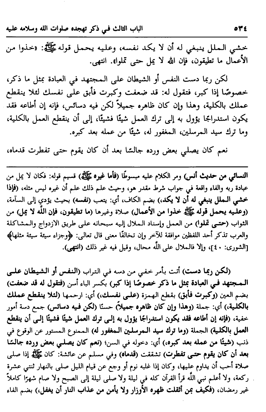 لكن ربما دست النفس أو الشيطان على المجتهد في العبادة بمثل ما ذكر، خصوصا إذا كبر، فتقول له: قد ضعفت وكبرت فأبق على نفسك لئلا ينقطع عملك بالكلية، وهذا وإن كان ظاهره جميلا لكن فيه دسائس، فإنه إن أطاعه فقد يكون استدراجا يئول به إلى ترك العمل شيئا فشيئا، إلى أن ينقطع العمل بالكلية، وما ترك سيد المرسلين، المغفور له، شيئا من عمله بعد كبره.