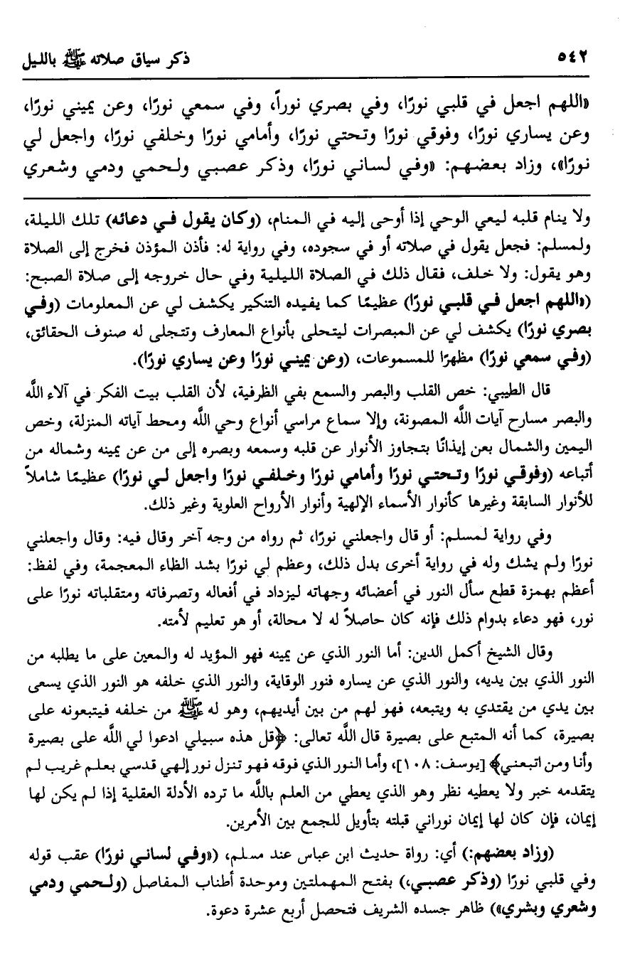 "اللهم اجعل في قلبي نورا، وفي بصري نورا، وفي سمعي نورا، وعن يميني نورا، وعن يساري نورا، وفوقي نورا وتحتي نورا، وأمامي نورا, وخلفي نورا، واجعل لي نورا"، وزاد بعضهم: "وفي لساني نورا". وذكر: عصبي ولحمي ودمي وشعري