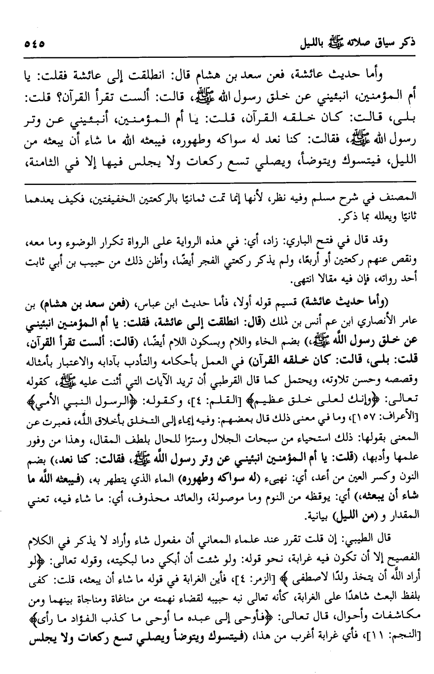 وأما حديث عائشة، فعن سعد بن هشام قال: انطلقت إلى عائشة فقلت: يا أم المؤمنين، أنبئيني عن خلق رسول الله صلى الله عليه وسلم، قالت: ألست تقرأ القرآن؟ قلت: بلى، قالت: كان خلقه القرآن، قلت: يا أم المؤمنين، أنبئيني عن وتر رسول الله صلى الله عليه وسلم، فقالت: كنا نعد له سواكه وطهوره، فيبعثه الله ما شاء أن يبعثه من الليل، فيتسوك ويتوضأ، ويصلي تسع ركعات ولا يجلس فيها إلا في الثامنة،
