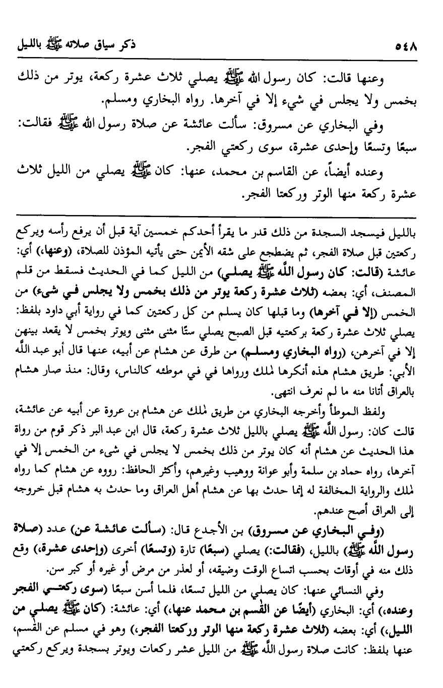 ولفظ الموطأ وأخرجه البخاري من طريق مالك عن هشام بن عروة عن أبيه عن عائشة، قالت كان: رسول الله صلى الله عليه وسلم يصلي بالليل ثلاث عشرة ركعة، قال ابن عبد البر ذكر قوم من رواة هذا الحديث عن هشام أنه كان يوتر من ذلك بخمس لا يجلس في شيء من الخمس إلا في آخرها، رواه حمد بن سلمة وأبو عوانة ووهيب وغيرهم، وأكثر الحافظ: رووه عن هشام كما رواه مالك والرواية المخالفة له إنما حدث بها عن هشام أهل العراق وما حدث به هشام قبل خروجه إلى العراق أصح عندهم.