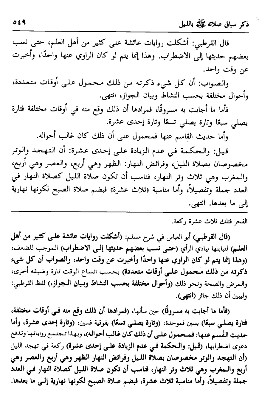 "فأما ما أجابت به مسروقا" حين سألها، "فمرادها أن ذلك وقع منه في أوقات مختلفة، فتارة يصلي سبعا" بسين فموحدة، "وتارة يصلي تسعا" بفوقية فسين، "وتارة إحدى عشرة، وأما حديث القاسم عنها: فمحمول على أن ذلك كان غالب أحواله" وبهذا تجتمع رواياتها وتدفع دعوى اضطرابها "قيل: والحكمة في عدم الزيادة على إحدى عشرة" ركعة في تهجد الليل "أن التهجد والوتر مخصوصان بصلاة الليل وفرائض النهار الظهر وهي أربع والعصر وهي أربع والمغرب وهي ثلاث وتر النهار، فناسب أن تكون صلاة الليل كصلاة النهار في العدد جملة وتفصيلا، وأما مناسبة ثلاث عشرة، فبضم صلاة الصبح لكونها نهارية إلى ما بعدها.