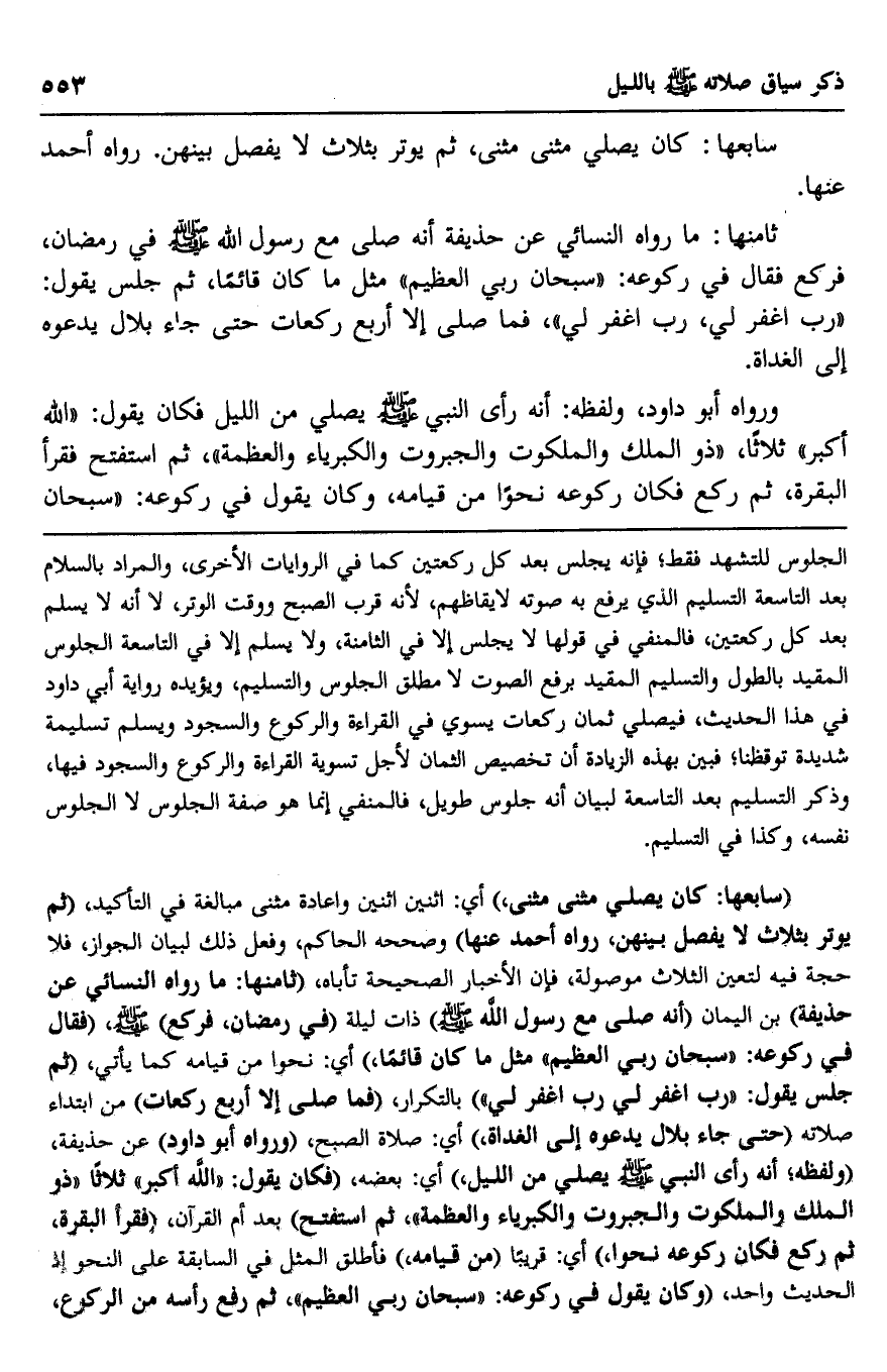 "سابعها: كان يصي مثنى مثنى" أي: اثنين اثنين وإعادة مثنى مبالغة في التأكيد، "ثم يوتر بثلاث لا يفصل بينهن، رواه أحمد عنها" وصححه الحاكم، وفعل ذلك لبيان الجواز، فلا حجة فيه لتعين الثلاث موصولة، فإن الأخبار الصحيحة تأباه، "ثامنها، ما رواه النسائي عن حذيفة" بن اليمان "أنه صلى مع رسول الله صلى الله عليه وسلم" ذات ليلة "في رمضان، فركع" صلى الله عليه وسلم "فقال في ركوعه: "سبحان ربي العظيم" مثل ما كان قائما" أي: نحوا من قيامه كما يأتي "ثم جلس يقول": "رب اغفر لي, رب اغفر لي" بالتكرار، "فما صلى إلا أربع ركعات" من ابتداء صلاته "حتى جاء بلال يدعوه إلى الغداة" أي: صلاة الصبح، "ورواه أبو داود" عن حذيفة، "ولفظه، أنه رأى النبي صلى الله عليه وسلم يصلي من الليل" أي: بعضه، "فكان يقول: "الله أكبر" ثلاثا "ذو الملك والملكوت والجبروت والكبرياء والعظمة" ثم استفتح" بعد أم القرآن، "فقرأ البقرة ثم ركع فكان ركوعه نحوا" أي: قريبا "من قيامه" فأطلق المثل في السابقة على النحو إذ الحديث واحد، "وكان يقول في ركوعه: "سبحان ربي العظيم" ثم رفع رأسه من الركوع،