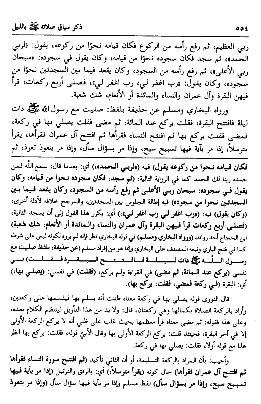ورواه البخاري ومسلم عن حذيفة بلفظ: صليت مع رسول الله صلى الله عليه وسلم ذات ليلة فافتتح البقرة، فقلت يركع عند المائة، ثم مضى فقلت يصلي بها في ركعة، فمضى فقلت يركع بها ثم افتتح النساء فقرأها ثم افتتح آل عمران فقرأها، يقرأ مترسلا، إذا مر بآية فيها تسبيح سبح، وإذا مر بسؤال سأل، وإذا مر بتعوذ تعوذ، ثم