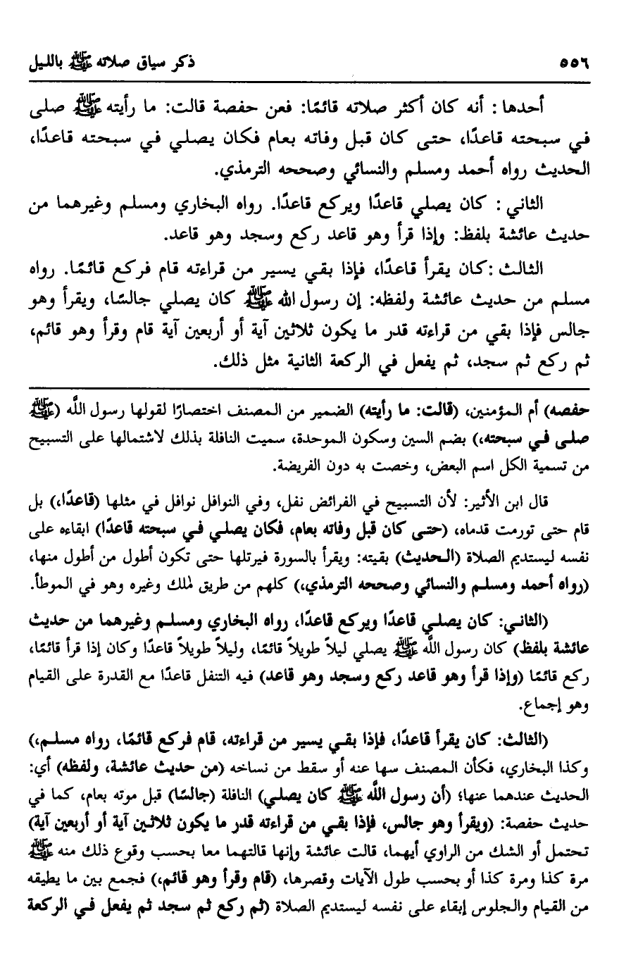 "الثاني: كان يصلي قاعدا ويركع قاعدا، رواه البخاري ومسلم وغيرهما من حديث عائشة بلفظ" كان رسول الله صلى الله عليه وسلم يصل ليلا طويلا قائما، وليلا طويلا قاعدا وكان إذا قرأ قائما، ركع قائما "وإذا قرأ وهو قاعد ركع وسجد وهو قاعد" فيه التنفل قاعدا مع القدرة على القيام وهو إجماع.
