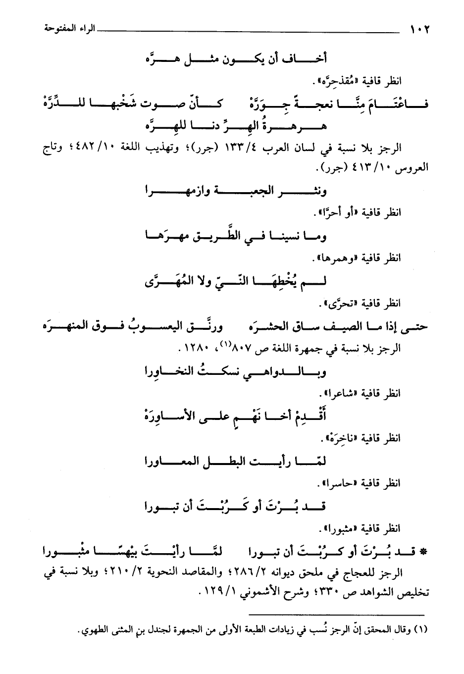 (¬1) وقال المحقق إن الرجز نسب في زيادات الطبعة الأولى من الجمهرة لجندل بن المثني الطهوي.