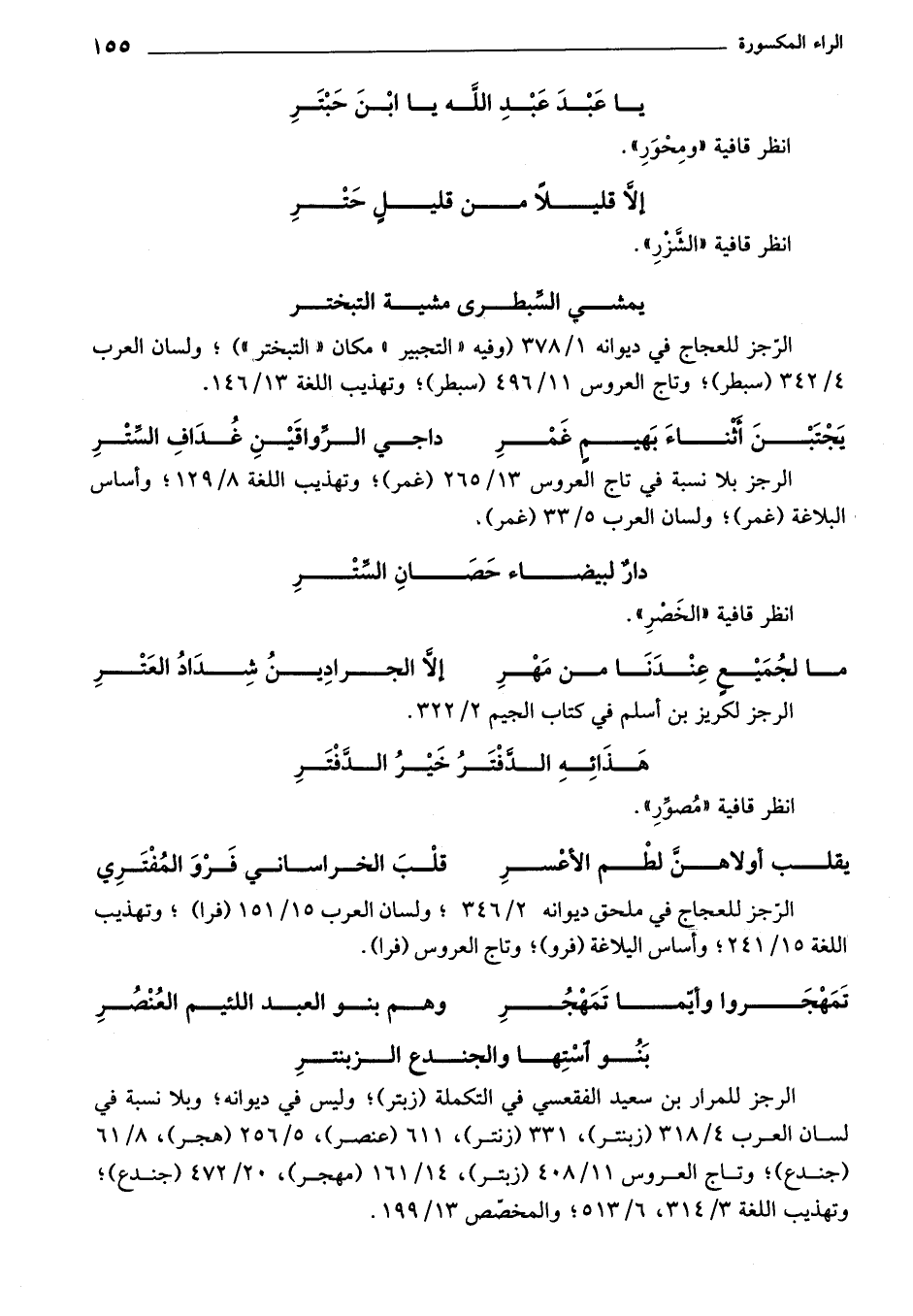 الرجز للمرار بن سعيد الفقعسي في التكملة (زبتر)؛ وليس في ديوانه؛ وبلا نسبة في لسان العرب 4/ 318 (زبنتر)، 331 (زنتر)، 611 (عنصر)، 5/ 256 (هجر)، 8/ 61 (جندع)؛ وتاج العروس 11/ 408 (زبتر)، 14/ 161 (مهجر)، 20/ 472 (جندع)؛ وتهذيب اللغة 3/ 314، 6/ 513؛ والمخصص 13/ 199.