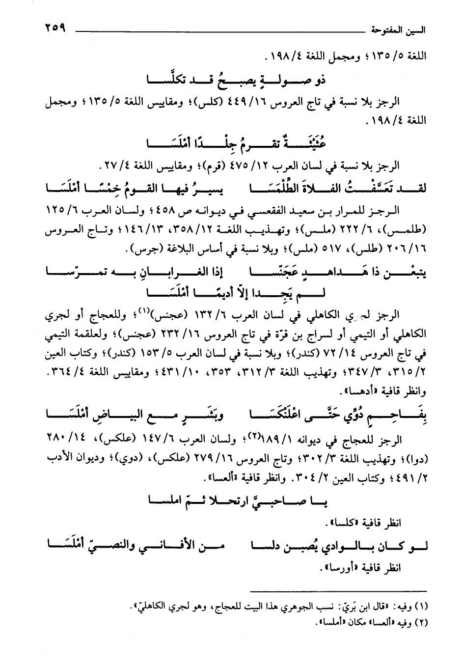 الرجز للمرار بن سعيد الفقعسي في ديوانه ص 458؛ ولسان العرب 6/ 125 (طلمس)، 6/ 222 (ملس)؛ وتهذيب اللغة 12/ 358، 13/ 146؛ وتاج العروس 16/ 206 (طلس)، 517 (ملس)؛ وبلا نسبة في أساس البلاغة (جرس).