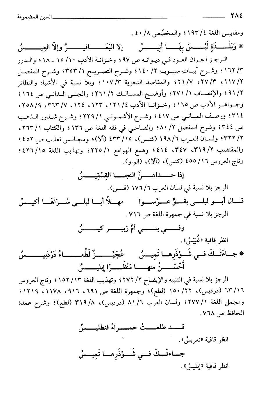 الرجز لجران العود في ديوانه ص 97؛ وخزانة الأدب 10/ 15 - 18؛ والدرر 3/ 162؛ وشرح أبيات سيبويه 2/ 140؛ وشرح التصريح 1/ 353؛ وشرح المفصل 2/ 117، 3/ 27، 7/ 21؛ والمقاصد النحوية 3/ 107؛ وبلا نسبة في الأشباه والنظائر 2/ 91؛ والإنصاف 1/ 271؛ وأوضح المسالك 2/ 261؛ والجنى الداني ص 164؛ وجواهر الأدب ص 165؛ وخزانة الأدب 4/ 121، 123، 124، 7/ 363، 9/ 258، 314؛ ورصف المباني ص 417؛ وشرح الأشموني 1/ 229؛ وشرح شذور الذهب ص 344؛ وشرح المفصل 2/ 80؛ والصاحبي في فقه اللغة ص 136؛ والكتاب 1/ 263، 2/ 322؛ ولسان العرب 6/ 198 (كنس)، 15/ 433 (ألا)؛ ومجالس ثعلب ص 452؛ والمقتضب 2/ 319، 347، 414؛ وهمع الهوامع 1/ 225؛ وتهذيب اللغة 15/ 426؛ وتاج العروس 16/ 455 (كنس)، (ألا)، (الواو).