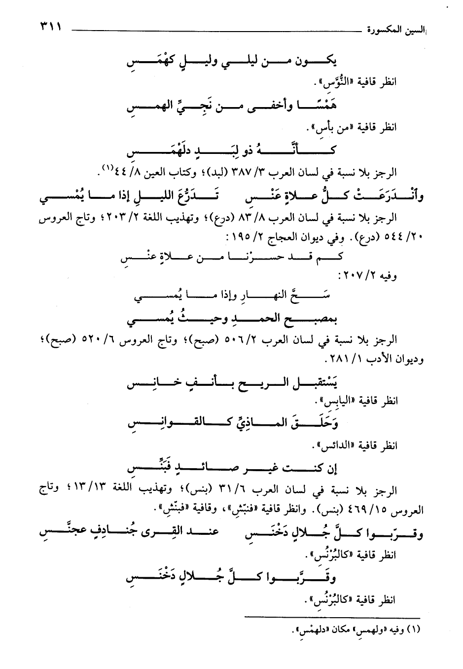 الرجز بلا نسبة في لسان العرب 6/ 31 (بنس)؛ وتهذيب اللغة 13/ 13؛ وتاج العروس 15/ 469 (بنس). وانظر قافية «فنبّشِ»، وقافية «فبنّشِ».