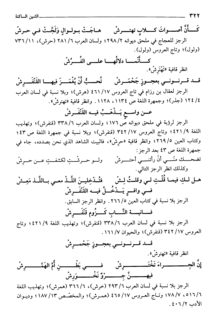الرجز لرؤبة في ملحق ديوانه ص 176؛ ولسان العرب 6/ 338 (قنفرش)؛ وتهذيب اللغة 9/ 421؛ وتاج العروس 17/ 342 (قنفرش)؛ وبلا نسبة في جمهرة اللغة ص 43؛ وكتاب العين 5/ 269؛ وانظر قافية «حرش»، فالبيت الشاهد الذي نحن بصدده، جاء في جمهرة اللغة ص 43 بعد الرجز: