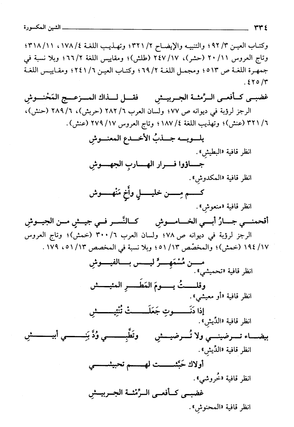 الرجز لرؤبة في ديوانه ص 77؛ ولسان العرب 6/ 282 (حربش)؛ 6/ 289 (حنش)، 6/ 321 (عنش)؛ وتهذيب اللغة 4/ 187؛ وتاج العروس 17/ 279 (عنش).